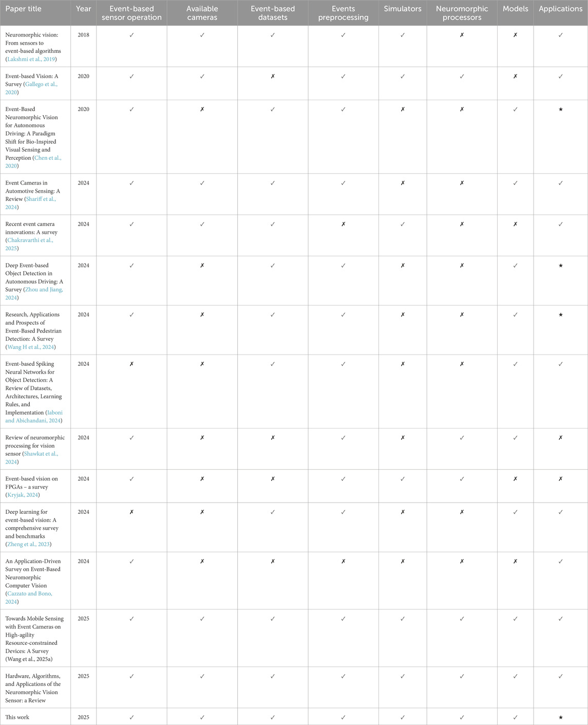 Table 1. Summary of existing surveys on event-based vision: from sensors and algorithms to processors (