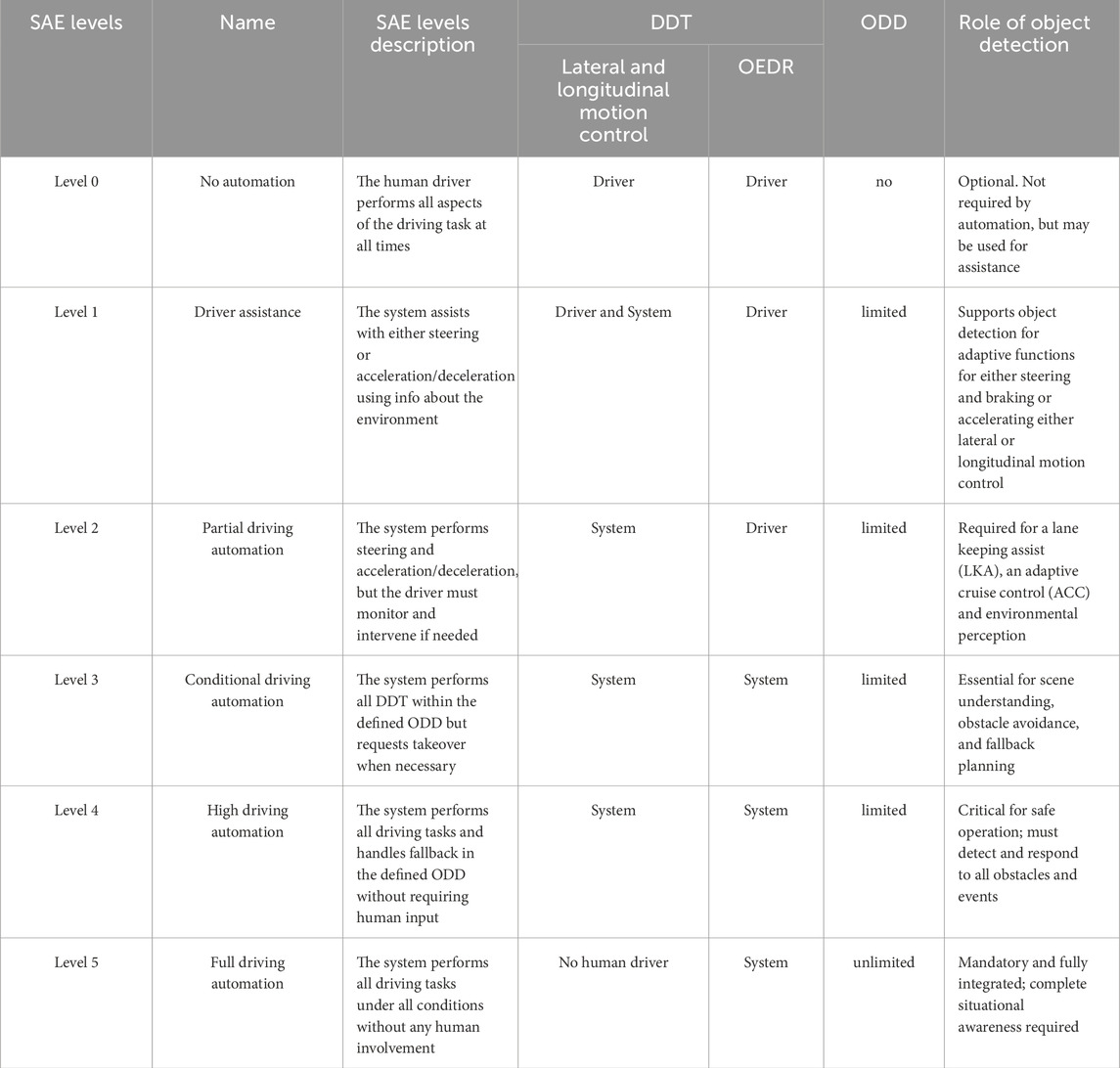 The Society of Automotive Engineers (SAE) defines six levels of autonomy in autonomous driving systems (Zhao et al., 2025). These levels are based on who performs the Dynamic Driving Task (DDT), either the driver or the system. A key part of DDT is Object and Event Detection and Response (OEDR), which refers to the system’s ability to detect objects in the environment, such as vehicles, pedestrians, and traffic signs, and respond appropriately. Level 0 of the SAE indicates no autonomy and full manual driving, while Levels 1 through 5 represent increasing degrees of automation, with each level incorporating more advanced autonomous features. As the level of autonomy increases, the vehicle’s reliance on intelligent systems becomes more critical for ensuring safe and efficient navigation in complex environments (Zhao et al., 2025; Balasubramaniam and Pasricha, 2022). The SAE also introduced the concept of the Operational Design Domain (ODD), a key characteristic of a driving automation system. Defined by the system’s manufacturer, the ODD outlines the specific conditions, such as geographic area, road type, weather, and traffic scenarios under which the autonomous system is intended to operate ERTRAC (2019). Overall, the SAE levels describe the degree of driver involvement and the extent of autonomy, while the ODD defines the specific conditions where and when that autonomy can be applied (Warg et al., 2023). Table 2 summarizes SAE Levels of automation for on-road vehicles and the role of object detection. Clearly, as the level of autonomy increases, the importance of object detection becomes increasingly critical.