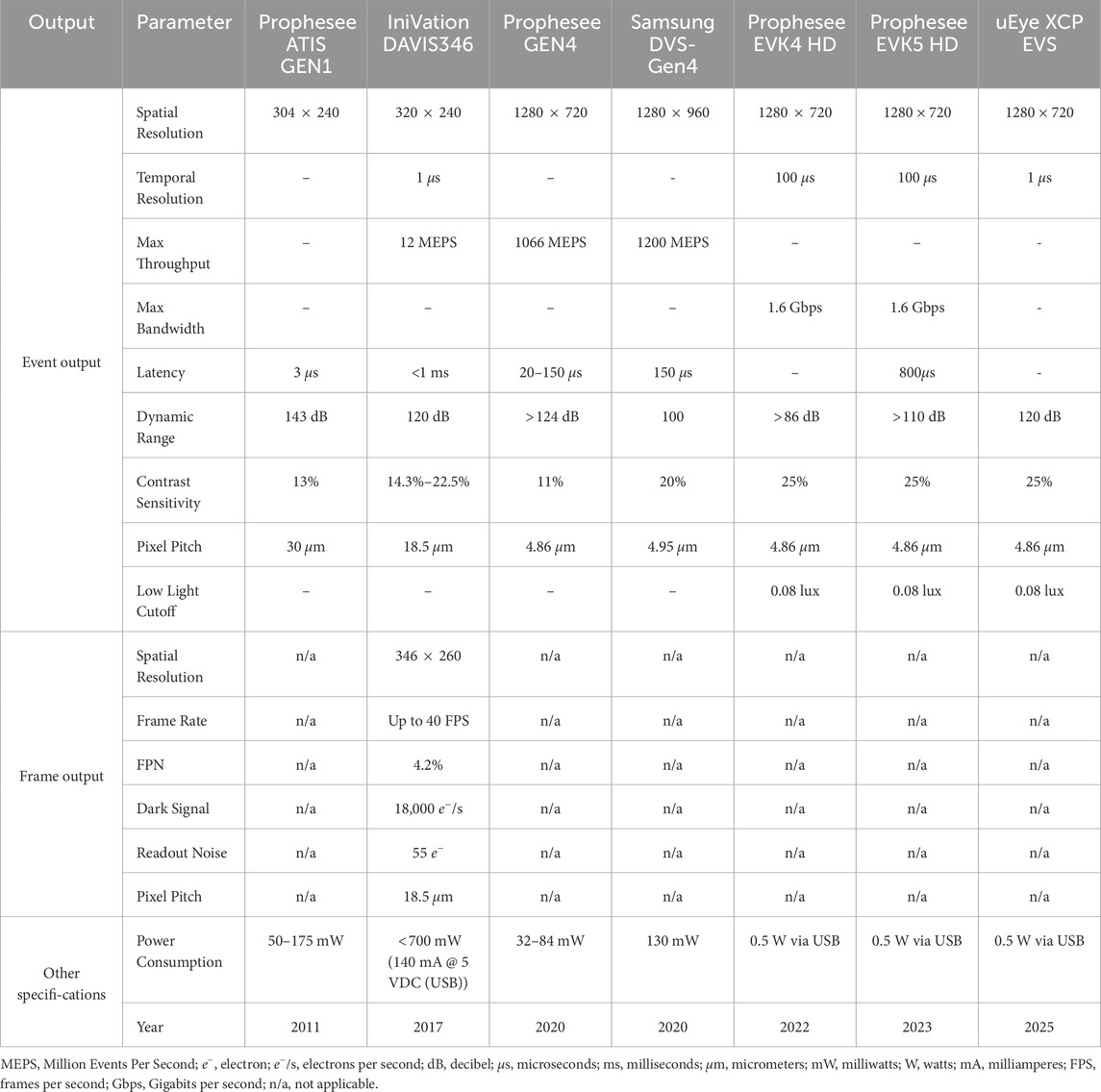 Table 3. Key commercial event cameras [adapted from (Gallego et al., 2020; Chakravarthi et al., 2024; Wang H. et al., 2025)].