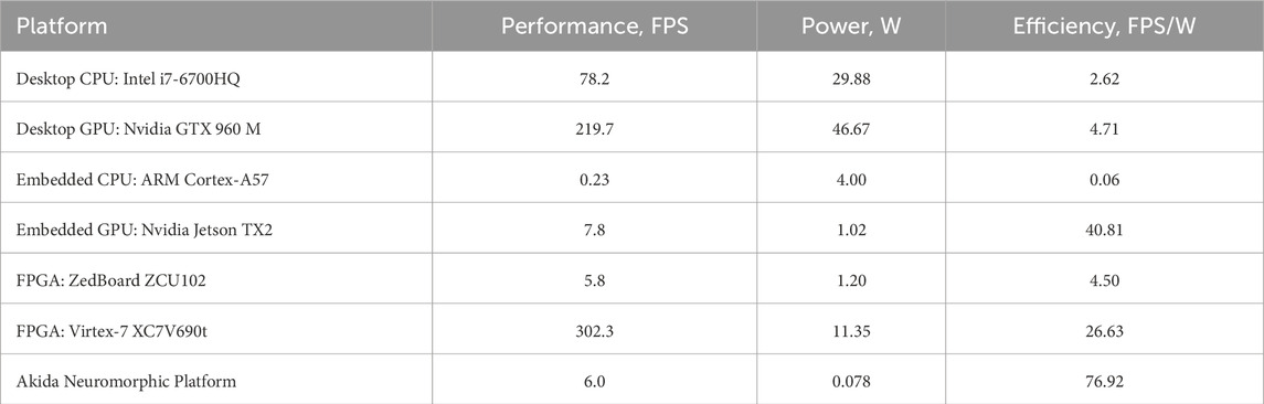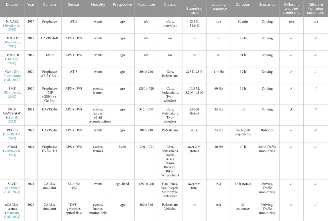 Among sensors used in the AD perception system, LiDAR offers high accuracy but suffers from high latency. Radar, on the other hand, provides low latency but lacks precision (Wang H. et al., 2025). Traditional frame-based cameras, which are currently the dominant type (Liu et al., 2024), face challenges in dynamic environments where lighting conditions change rapidly or where extremely high-speed motion is involved. The typical dynamic range of frame-based cameras is around 60 dB (Gallego et al., 2020), and in the high-quality frame cameras, it does not exceed 95 dB (Chakravarthi et al., 2025). The power consumption of these cameras is 1–2 W with a data rate around 30–300 MB/s and a latency of 10–100 ms (Xu et al., 2025). Therefore, recently introduced event-based cameras have gained attention for their distinct operating principles, which are inspired by biological vision systems. This approach emulates the way the brain and nervous system process sensory input, inherently exhibiting neuromorphic properties (Lakshmi et al., 2019). Unlike traditional frame-based cameras that capture the entire scene at fixed intervals, event-based cameras detect changes in brightness at each pixel asynchronously and record events only when a change occurs (Kryjak, 2024; Reda et al., 2024). As a result, they offer faster update rates in the range of 1–10
