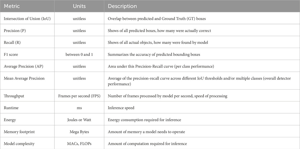All aforementioned surveys provide important insights into event-based vision and are summarized in Table 1. Building on these contributions, our survey provides an end-to-end review of event-based vision, covering event-based sensor architectures, key datasets with a focus on object detection in autonomous driving, and the full pipeline from data preprocessing and processing to postprocessing. In addition, we discuss benchmarking metrics designed to support fair and consistent evaluation across different processing approaches and hardware accelerators, aiming to ensure a balanced comparison. This work provides a summary of popular evaluation metrics for object detection models and evaluation of system-level throughput that includes conversion events to the required data format.