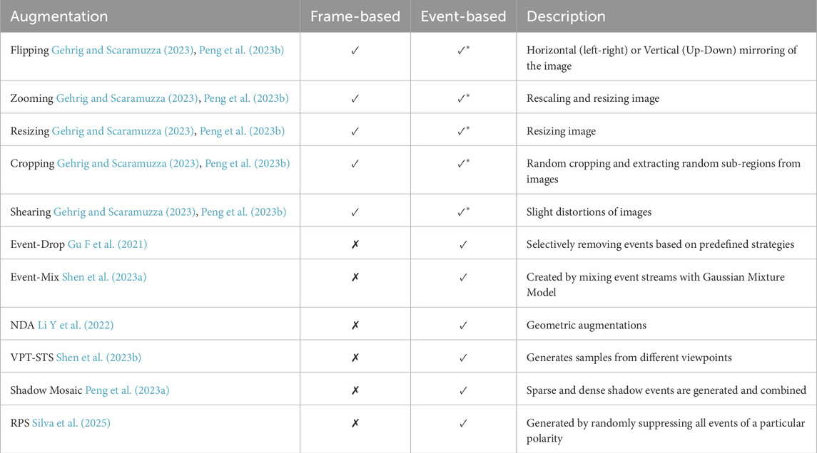 Event-based datasets remain underrepresented. Additionally, the accuracy of object detection is influenced by dataset labeling and its temporal frequency. If labels are sparse in time, the model may miss critical information, especially in high-speed scenarios. On the other hand, higher labeling frequency can become redundant in low-motion scenes and is often expensive to implement manually. To address the scarcity of well-labeled event-based datasets, the overlap between event-based and frame-based data can be exploited to generate additional labeled event datasets (Messikommer et al., 2022). In (Perot et al., 2020), event-based and frame-based cameras were paired as in the 1MP dataset. Since frame-based and event-based sensors were placed side by side, a distance approximation was applied afterwards, and labels extracted from the frame-based camera were transferred to event-based data. Another option suggests the generation of event-based data from existing video using video-to-event conversion (Gehrig et al., 2020).
