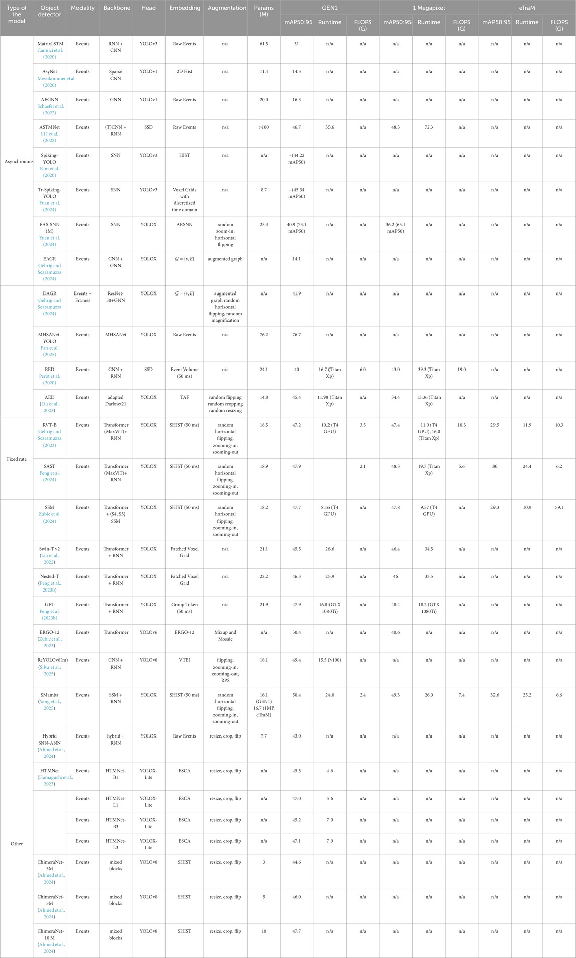 The transformer-based framework for streaming object detection (SODformer) also operates asynchronously without being tied to a fixed frame rate (Li et al., 2023). SODformer was designed for object detection based on heterogeneous data, and, to improve detection accuracy from event- and frame-based streams, it introduced transformer and asynchronous attention-based fusion modules. The performance of SODformer was evaluated on the multimodal PKU-DAVIS-SOD dataset.
