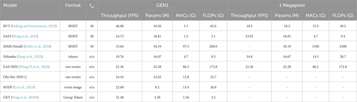In addition to mAP, which represents the prediction quality, the number of floating point operations (FLOPs) is commonly used to measure the computational efficiency and complexity of a model (Messikommer et al., 2020). For asynchronous models, where data is event-driven rather than frame-based, the adopted metric is FLOPs per event (FLOPs/ev) (Santambrogio et al., 2024), which more accurately reflects the computational cost relative to the number of events processed.
