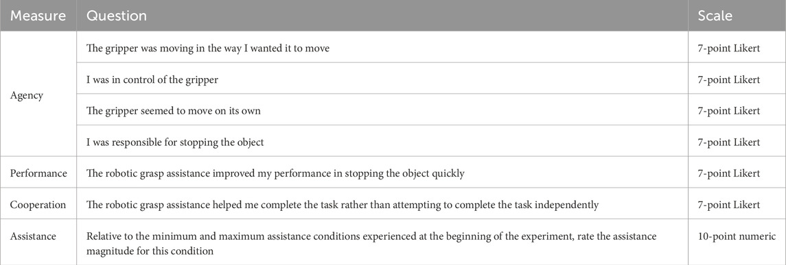 After each condition, participants answer a set of survey questions (see Table 1). Four seven-point Likert questions, adapted from previously published work on agency (Bekrater-Bodmann, 2020; Kalckert and Ehrsson, 2012), evaluate participant sense of agency. These questions are positively or negatively worded regarding the sense of agency and scored accordingly. The scores are summed to obtain an aggregate agency score between four and 28. We also measure the perceived assistance provided by each delay condition on a ten-point scale. We include two more seven-point Likert questions to measure each participant’s perceived improvement in stopping the falling object relative to the unassisted condition (Improved Performance) and the perceived cooperation of the robotic assistance in completing the task (Cooperated). We include these questions on perceived assistance, improvement, and robot cooperation, listed in Table 1, to explore what factors might contribute to the sense of agency.