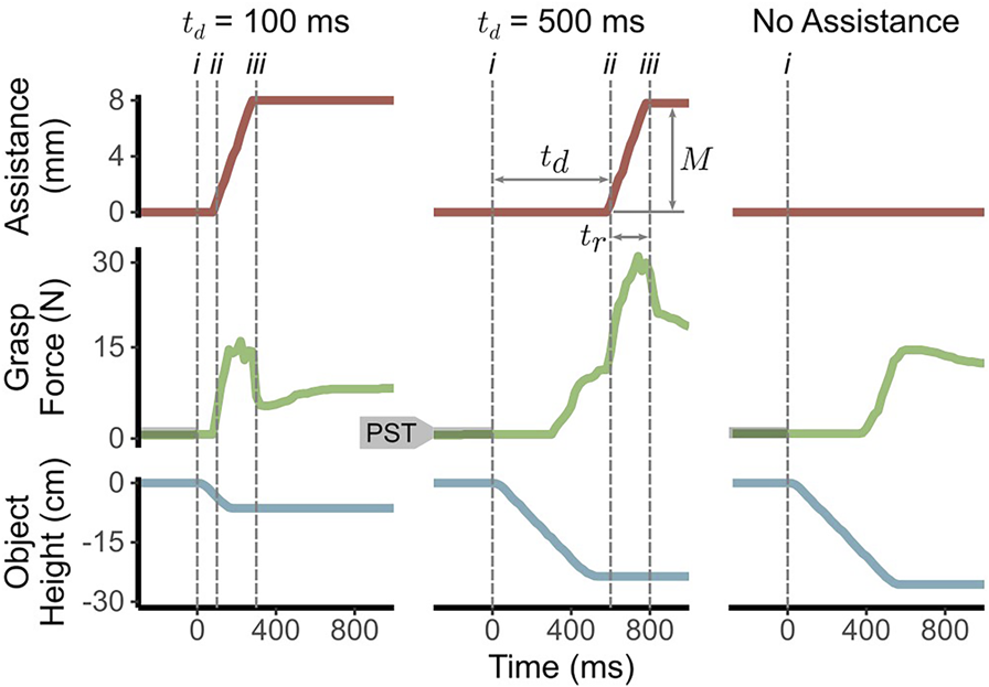 Sample assistance, grasp force, object height data measured over time for an individual trial from two assistance conditions ( ms, ms) and the unassisted condition. The delay , duration , and magnitude of assistance are labeled for the ms trial. Dashed grey vertical lines mark i) the beginning of object slip, ii) the start of assistance ramp-up, and iii) the end of assistance ramp-up after which it remains constant. Both assistance trials use ms and mm. The Pre-Slip Threshold (PST) for grasp force is shown by the shaded grey regions in the grasp force plots.