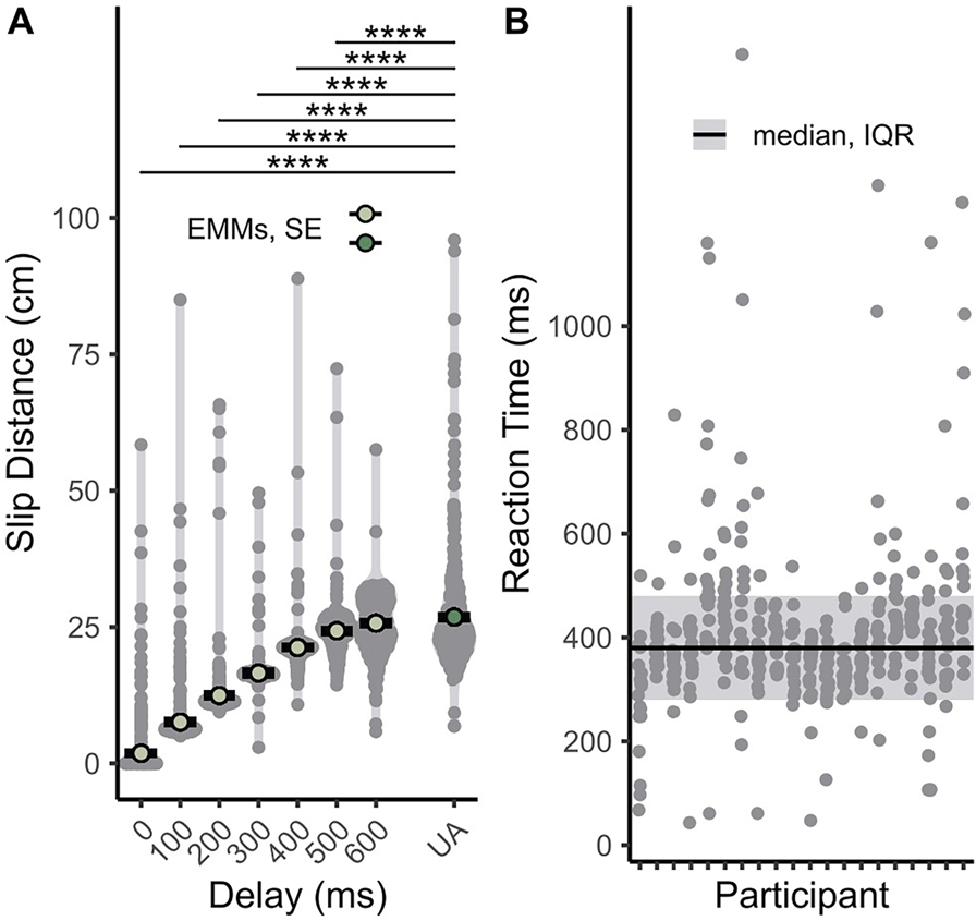 Summary of results from slip distance across different assistance delays (A) and participant reaction times (B). In (A), smaller grey dots represent raw data points, and larger colored dots represent estimated marginal means. Black horizontal bars depict standard error. The unassisted condition is represented by the “UA” label and dark green dot. Asterisks denote significant pairwise comparisons between estimated marginal means of the assisted and the unassisted conditions (* , ** , *** , **** ). The solid horizontal line and shaded region in (B) depict the overall median and IQR, respectively.