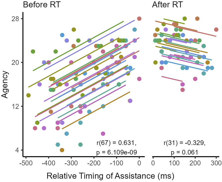 To further investigate the effect of assistance delay on agency, we analyze the relationship between agency and the timing of assistance relative to median subject reaction times using repeated measures correlations to account for within-subject dependence. We run separate correlations to determine trends in agency before and after subject reaction times. These correlations only include agency results from assisted conditions, as is undefined for the unassisted condition.