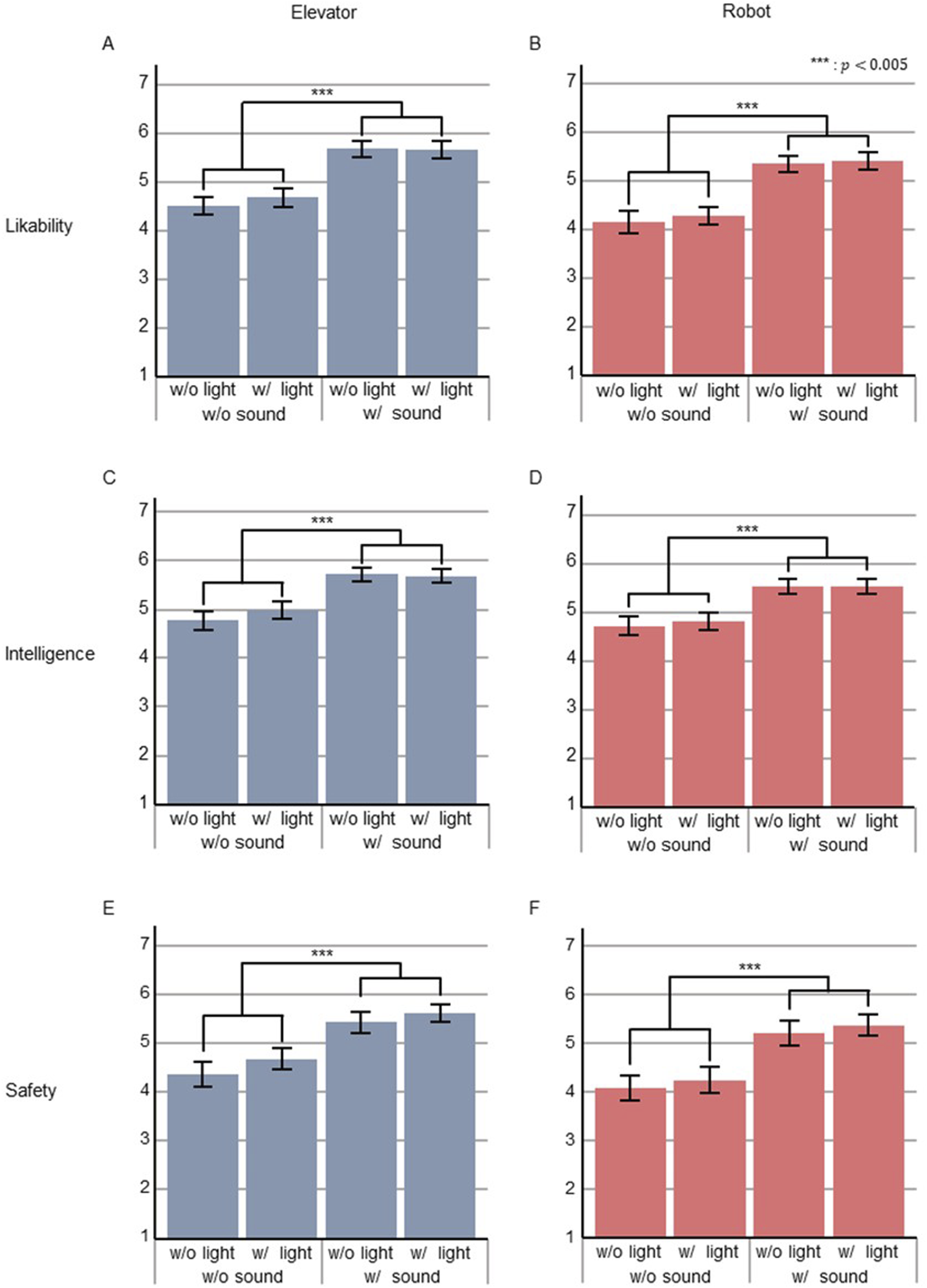 We conducted a two-way factorial (sound and light) ANOVA to analyze the questionnaire results regarding the impression scales of Experiment A (Figure 5). The statistical analysis of the elevator’s likability scale showed a significant difference in the sound factor (), and no significant differences in the light factor or in the interaction effects (Figure 5A). The statistical analysis of the robot’s likability scale showed a significant effect of the sound factor (), and no significant differences in the light factor or in the interaction effects (Figure 5B). The statistical analysis of the elevator’s intelligence scale showed a significant difference in the sound factor (), and no significant differences in the light factor or in the interaction effects (Figure 5C). The statistical analysis of the robot’s intelligence scale showed a significant effect of the sound factor (), and no significant differences in the light factor or in the interaction effects (Figure 5D). The statistical analysis of the elevator’s safety scale showed a significant effect of the sound factor (), and no significant differences in the light factor or in the interaction effects (Figure 5E). Finally, the statistical analysis of the robot’s safety scale showed a significant effect of the sound factor (), and no significant differences in the light factor or in the interaction effects (Figure 5F).