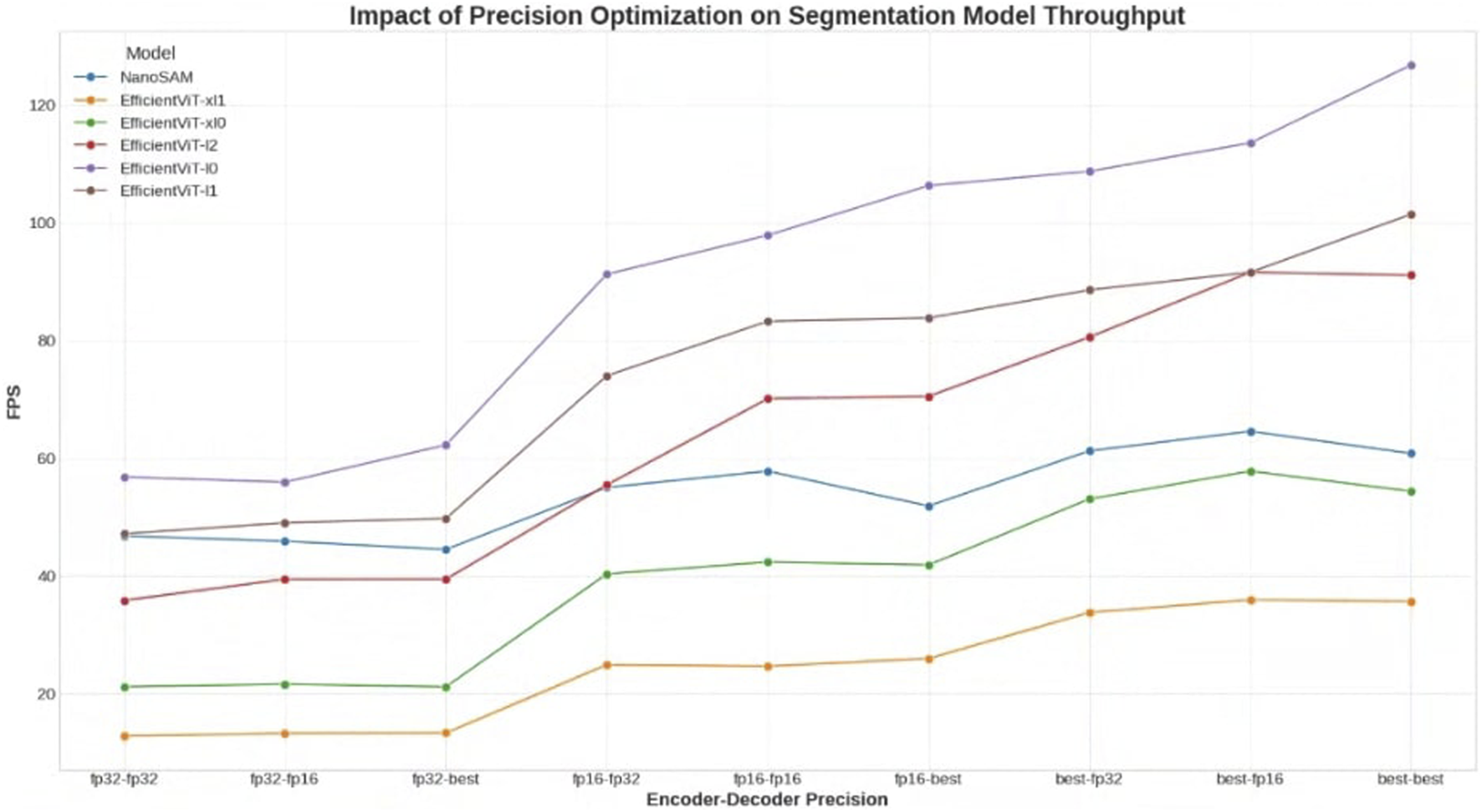 Performance analysis of prompt-based segmentation models across various precision configurations. The chart plots the throughput (FPS) of six segmentation models (five variants of EfficientViT-SAM and NanoSAM) as a function of the precision settings for their respective encoder and decoder components. Precision configurations range from 32-bit floating-point (fp32) to 16-bit floating-point (fp16) and a mixed-precision ‘best’ mode optimized by TensorRT. The results demonstrate a clear trend of performance improvement as precision is lowered, particularly for the encoder.