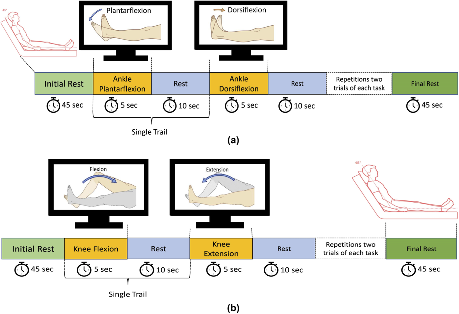 (a) Schematic of the experimental paradigm for ankle dorsiflexion and plantarflexion tasks; (b) Schematic of the experimental paradigm for knee flexion and extension tasks. Reprinted with permission from Minhas et al. (2024a), Copyright © 2024, IEEE.