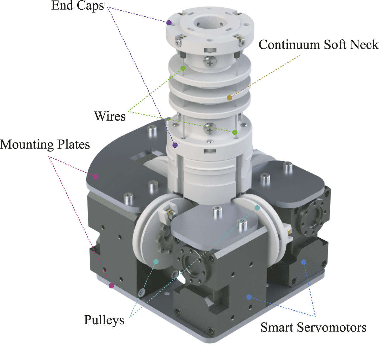 Figure 2. Graphical representation of the soft robotic neck module with annotated main properties. Adapted in part from Andrikopoulos et al. (2024), © IEEE 2024, with permission.