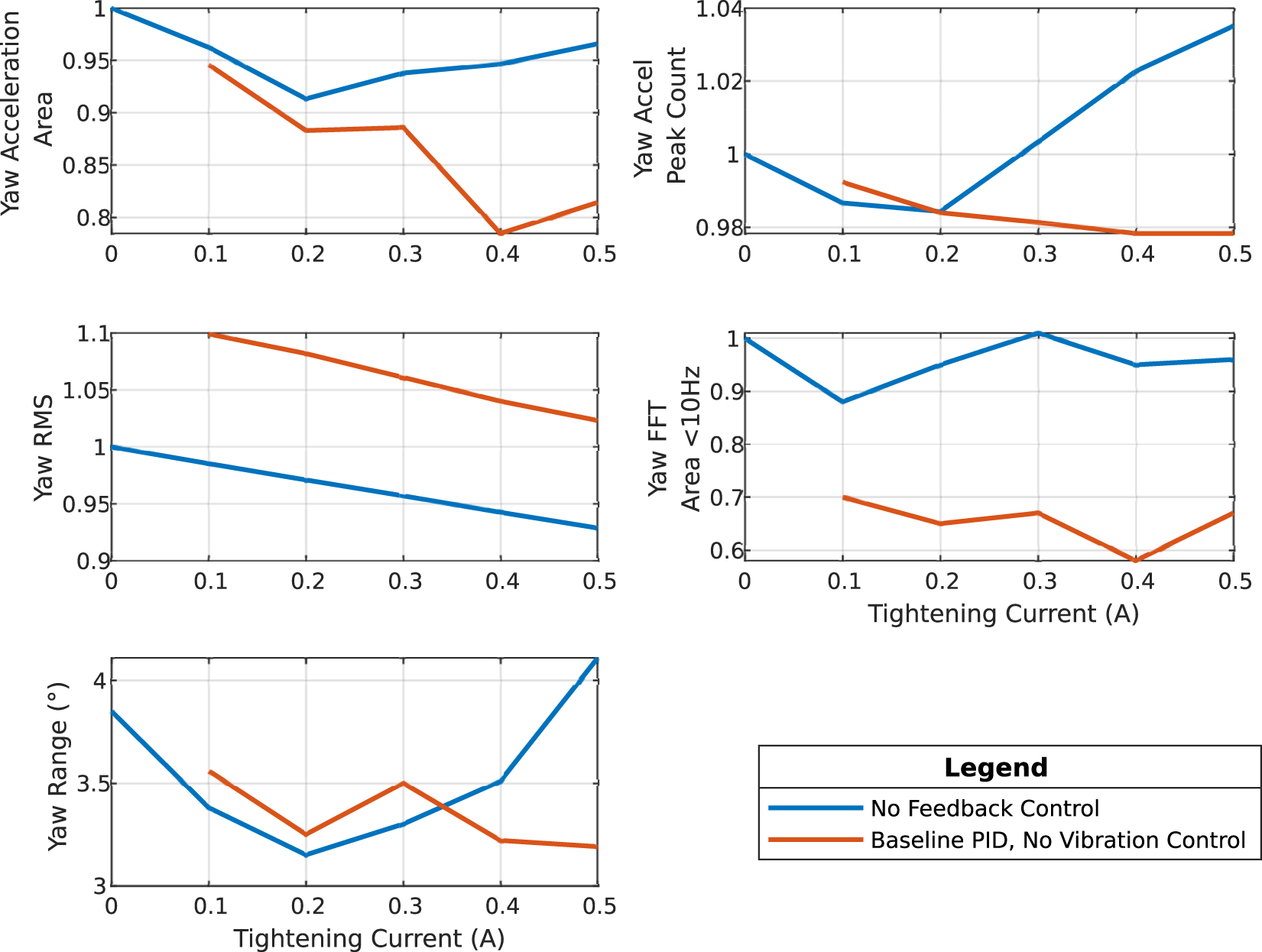 • Yaw acceleration area (Metric 1) was reduced by over 60% compared to baseline.