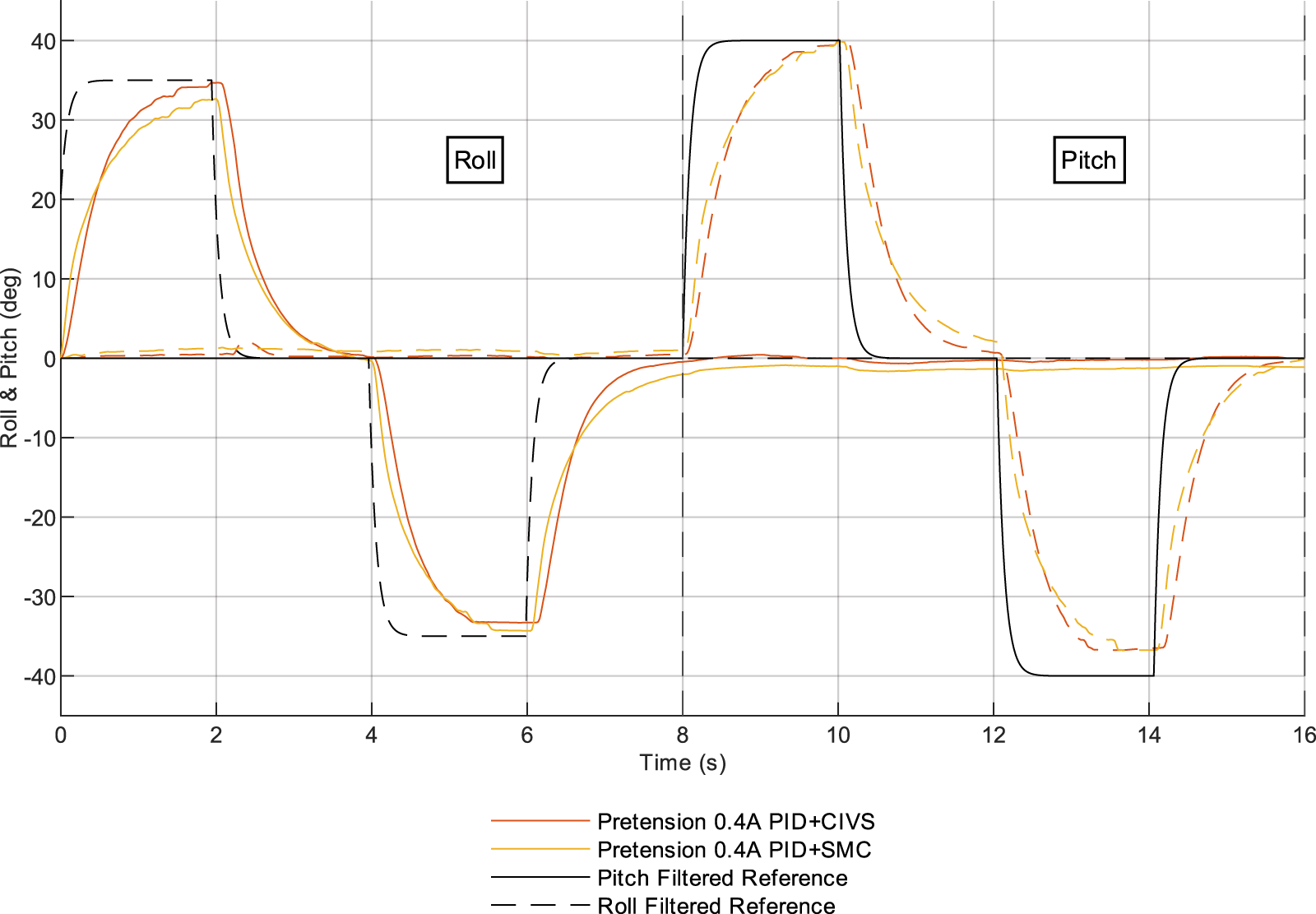 The roll and pitch tracking results also reveal an important limitation: the effective closed-loop bandwidth of the system is fundamentally constrained by the motor dynamics and continuum mechanics.