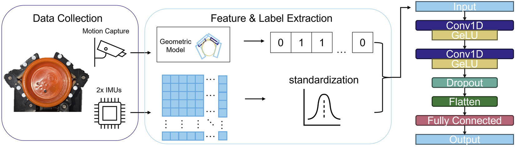 During the manipulation trials, the two finger gripper is placed in a motion tracking testbed. The accelerometer and gyroscope data from the fingertips is concatenated into feature matrices and preconditioned for machine learning. The motion tracking is used to reconstruct the scene geometry, which is in turn used to assign a binary slip label at each of a series of discrete timesteps. These feature matrices and binary labels are then fed into the CNN, the architecture of which is illustrated on the right.