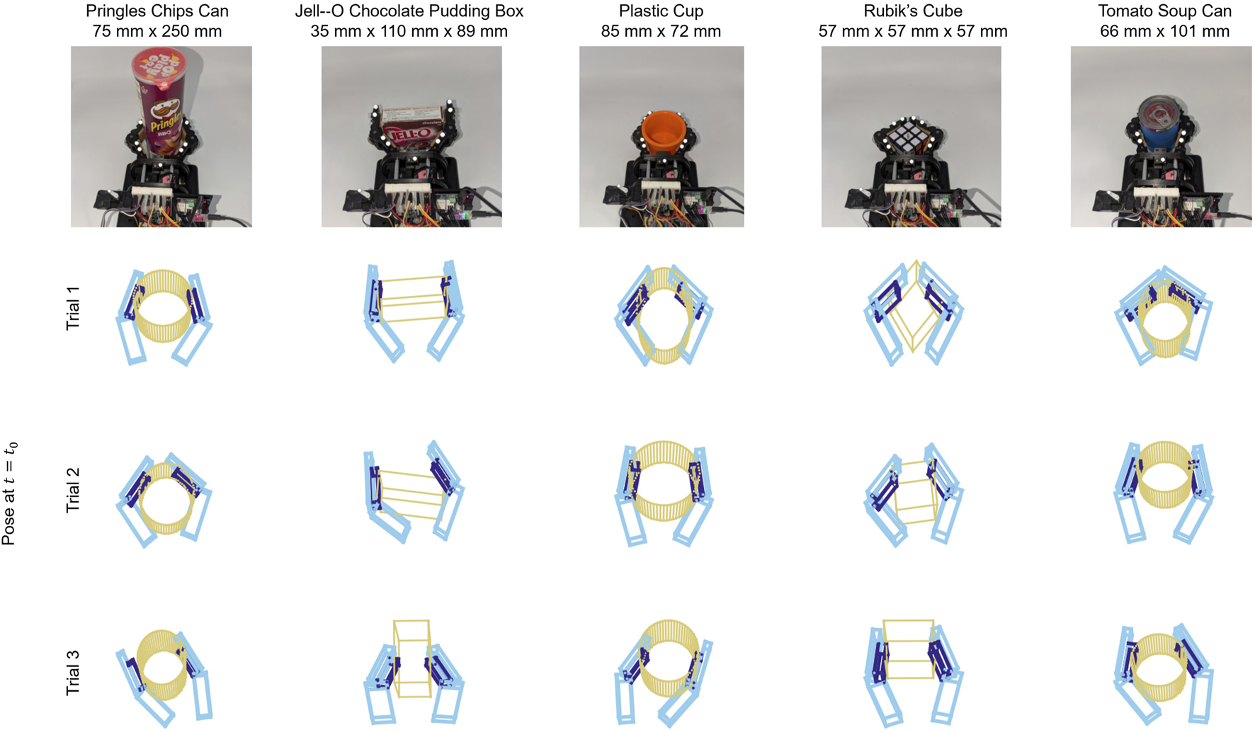 With our custom-made gripper (Section 3.2), we conducted a series of manipulation trials using five objects from the YCB Object Set (Calli et al., 2015): a Pringles chips can, a Jello pudding box, a plastic cup, a Rubik’s cube, and a tomato soup can. The objects were chosen based on their suitability for the gripper (e.g., size), rigidity, and ease of geometric representation (i.e., symmetry). For each object, we designed a close-fitting cap with indentations which we used to mount motion tracking markers in a fixed pattern (Figure 3, left).