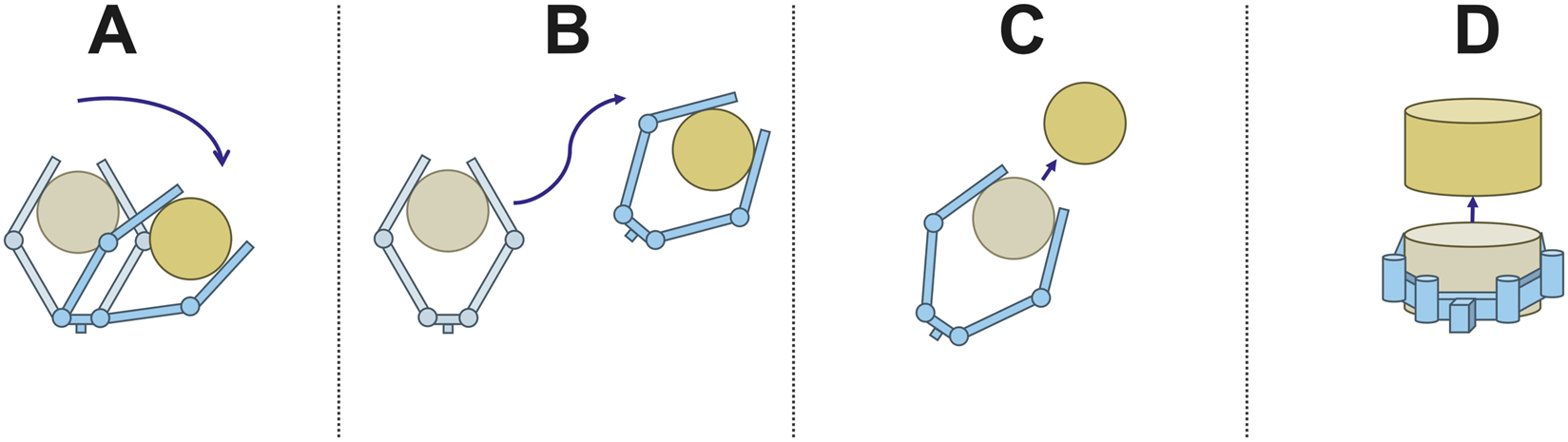 Illustrations of the four manipulation scenarios. In scenario (A), the object shifts downward and to the right, and the fingers of the gripper reconfigure but stay in contact. In scenario (B), the gripper rotates and translates while its configuration remains the same and the object remains stably grasped. In scenario (C), the object is lost from the hand while moving in the plane. In scenario (D), the object is lost while moving out of the plane.