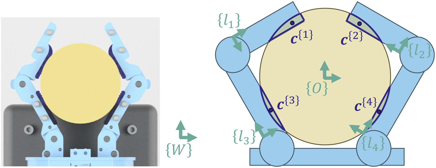To label the data, we begin by reconstructing the geometry of the hand and object at each timestep. We use Motive to track the three-dimensional positions of the markers on the hand and object. Let be the world frame (defined by Motive). Using the measured locations of the motion tracking markers, we can reconstruct the six-dimensional pose of the object and each of the four finger links. More specifically, we attach a reference frame to each of these five bodies and encode the poses as homogeneous transforms between each frame and the world frame, {W} (Figure 6). We then model each body as a simple polyhedron using Geometry3D in Python (Minghao, 2020). The only exception is the distal finger links of the hand. Because they have an overhang that extends beyond the finger pad, they are each treated as a pair of rectangular prisms, arranged flush with each other. This results in three finger polyhedrons for each finger: a proximal finger link polyhedron, a distal link polyhedron representing the finger pad area, and a distal link polyhedron representing the overhang. The two fingers combined are therefore made up of six total polyhedrons.