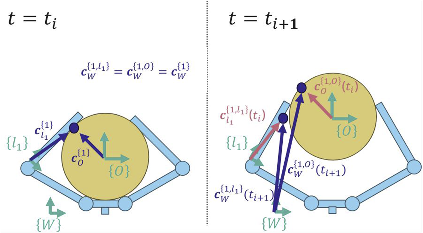 Each contact point is defined by a position along the link and a position on the object. At time , the contact point is shared by both link and the object (left). When time moves forward to , we can calculate the new location of the point on each respective body using their body-frame coordinates from the previous time (right). See Equations 2, 3 for more details.