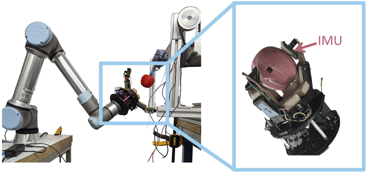 To test the applicability of our trained network to real-world robotic manipulation tasks, we gathered additional data from a robot performing a fruit-picking task. We first recorded video and sensor measurements from 77 pick attempts on our physical proxy orchard system described in Velasquez et al. (2022). In our previous work, we demonstrated that models trained on in-hand data from a fruit picking task using the proxy orchard perform comparably in the orchard to those trained on data collected directly from the orchard itself. These pick attempts were performed with our custom three-fingered end effector (Dischinger et al., 2021) attached to an industrial manipulator arm (UR5e, Universal Robots, Odense, Denmark) (see Figure 9). Each distal link of the end effector is equipped with a 6-axis inertial measurement unit (MPU6055), which was sampled at a rate of 70 Hz. For each pick attempt, we replicated the relative starting pose of the gripper with respect to the apple from one of our field trials (Velasquez et al., 2022), then added a small random offset to the position and orientation to create a unique pick attempt. The gripper then closed, and the robot pulled back a fixed distance along a path coincident with the vector normal to the palm. We reviewed timestamped video of the experiments and recorded the start and end time of any visually-observable slip events. These times were used to label the grasp at every experiment time as either slipping or static (i.e., no visual change in the pose of the apple with respect to the gripper). That is, times after the slip started and before it concluded are labeled as slip and all other times are labeled as static.
