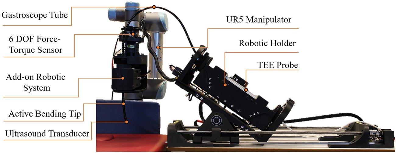Figure 2. Prototype of the robotic TEE system featuring the 6-DOF robotic holder, 2-DOF add-on subsystem mounted on UR5 manipulator, and integrated TEE probe. This Prototype is Based on the Conceptual Design and Meets the Clinical Requirements.