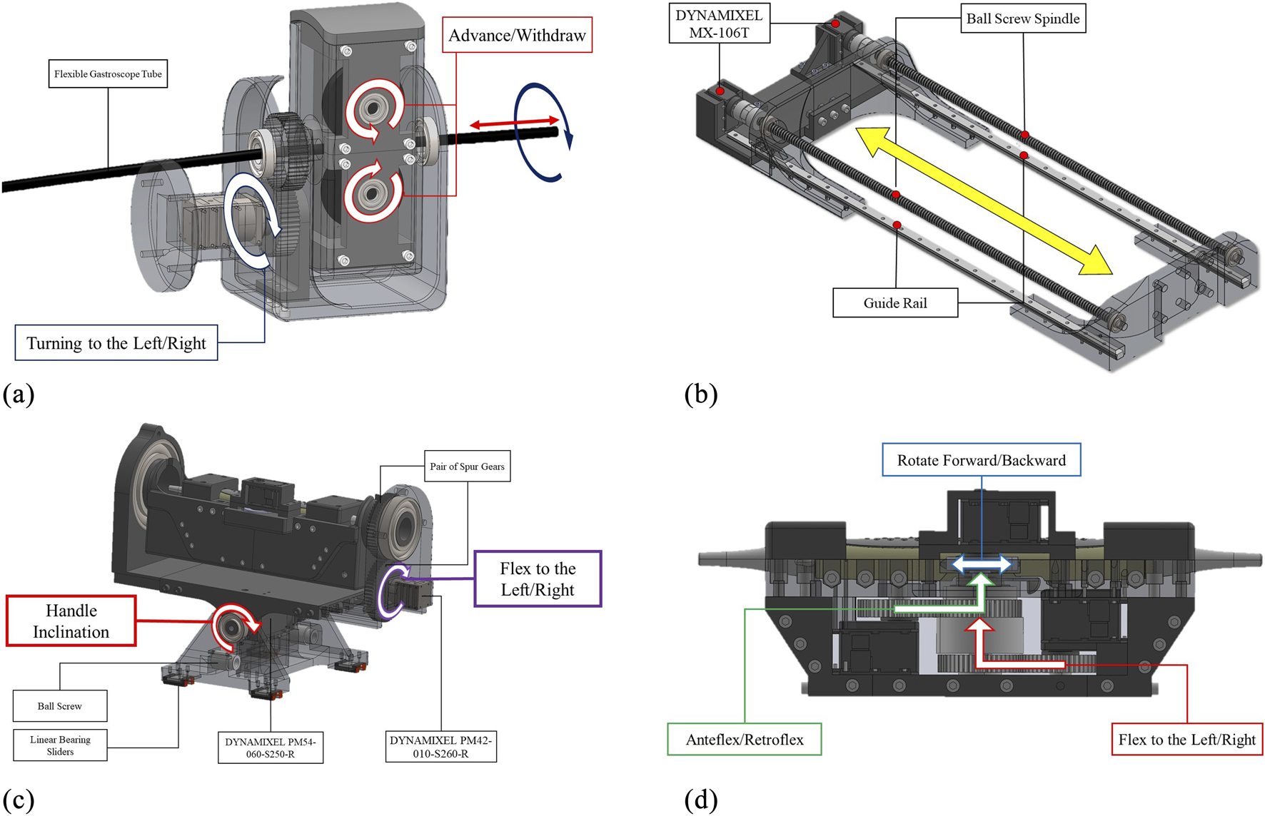 Figure 3. Engineering design of the developed robotic system in this paper: (a) Add-on subsystem with leader controls for advance/withdraw and left/right turning mechanisms, (b) Robotic holder’s follower advance/withdraw mechanism synchronized with the add-on subsystem, (c) Holder subsystem featuring handle inclination control and follwer left/right turning mechanism, and (d) Holder subsystem’s probe manipulation controls including anteflexion/retroflexion, lateral flexion, and multiplane rotation. Redundant DOFs between subsystems are synchronized to ensure identical coordinated motions.