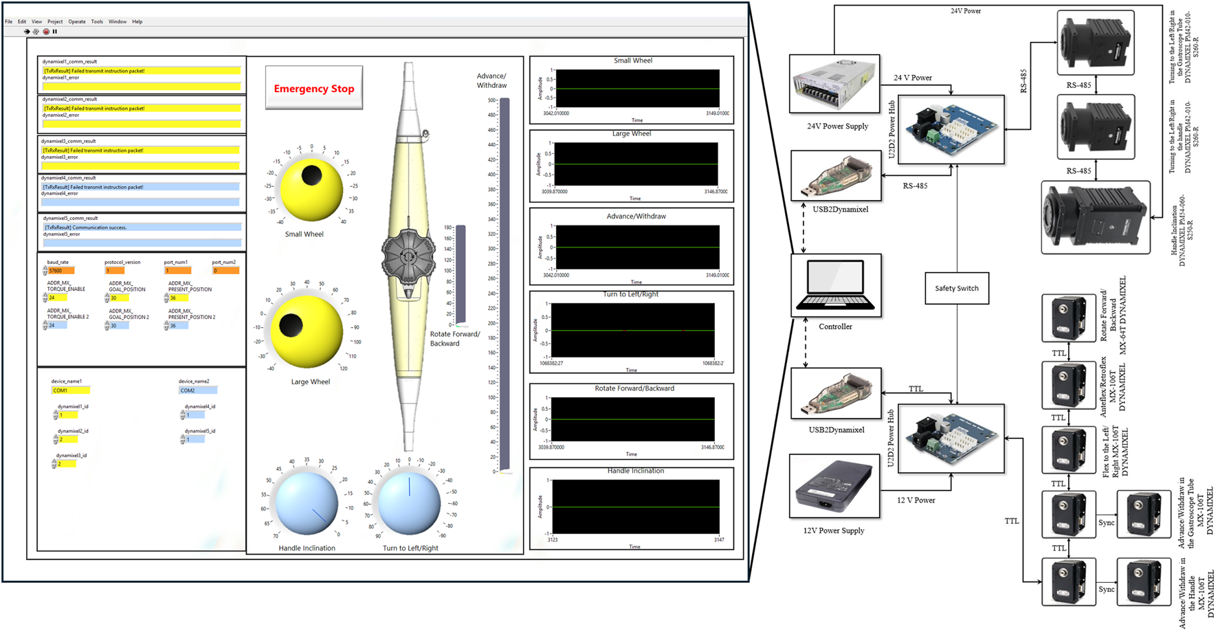 Figure 4. Control architecture and electrical schematic of the robotic system developed in this paper. The LabVIEW user interface (left) provides control panels for all DOFs, position feedback visualization, and emergency stop functionality. The electrical schematic (right) shows the dual-network architecture with TTL-based (12V) and RS-485-based (24V) servomotor networks, USB2Dynamixel interfaces, power distribution hubs, and centralized safety switch integration.