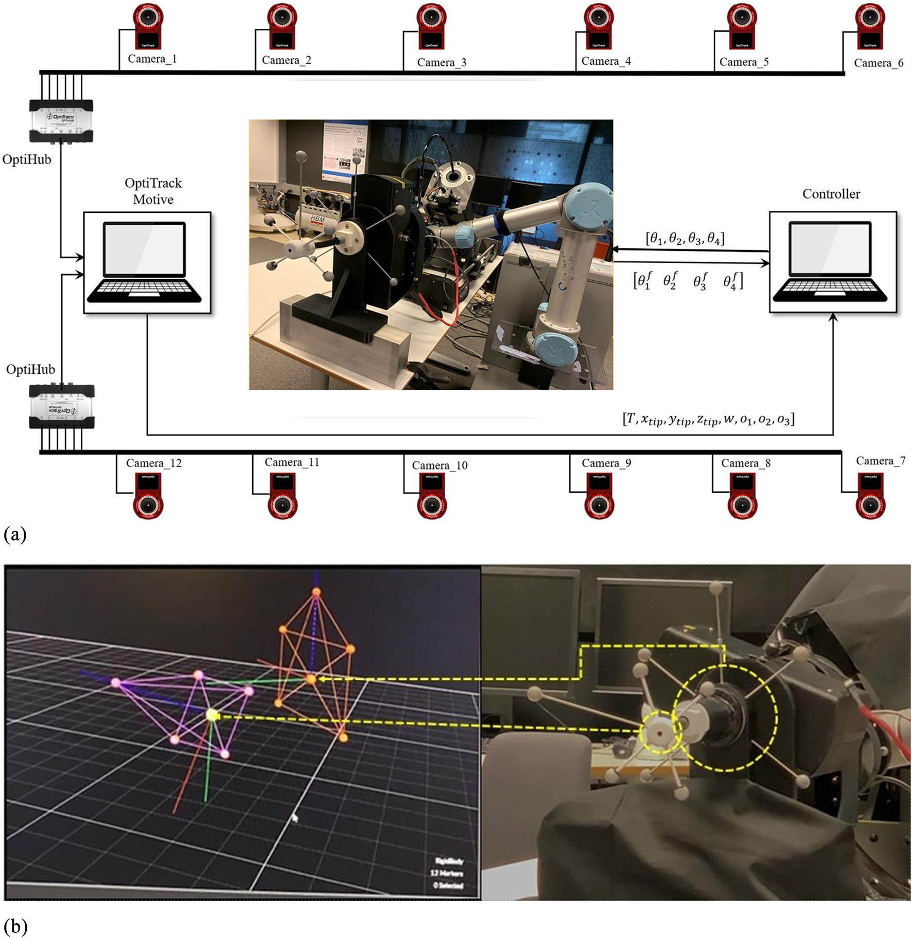 Figure 6. Experimental data acquisition setup. (a) OptiTrack visualization of tracked rigid bodies attached to the TEE transducer (purple) and continuum mechanism base (orange). (b) System schematic showing 12-camera OptiTrack array, system architecture with motion capture data transmitted via UDP/Ethernet and robot commands sent through TTL/RS-485 protocols, enabling synchronized pose tracking and motor command recording.