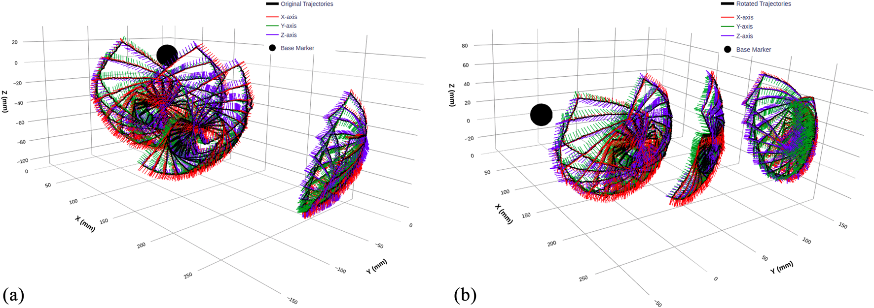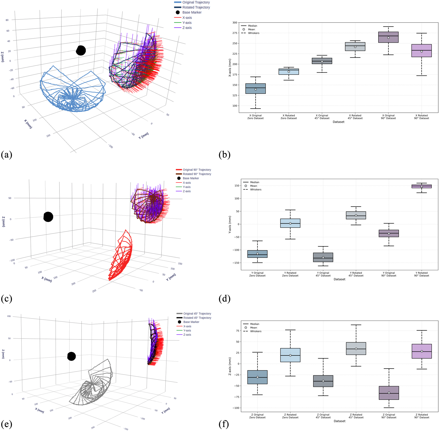 The performance comparison between original and rotated datasets validates the model’s coordinate frame independence. Analysis of the original and rotated datasets reveals consistent performance: the average test RMSE across all configurations is 1.223 mm for the original dataset and 1.283 mm for the rotated dataset, a difference of only 0.06 mm. For orientation metrics, the average difference is 1.02°.