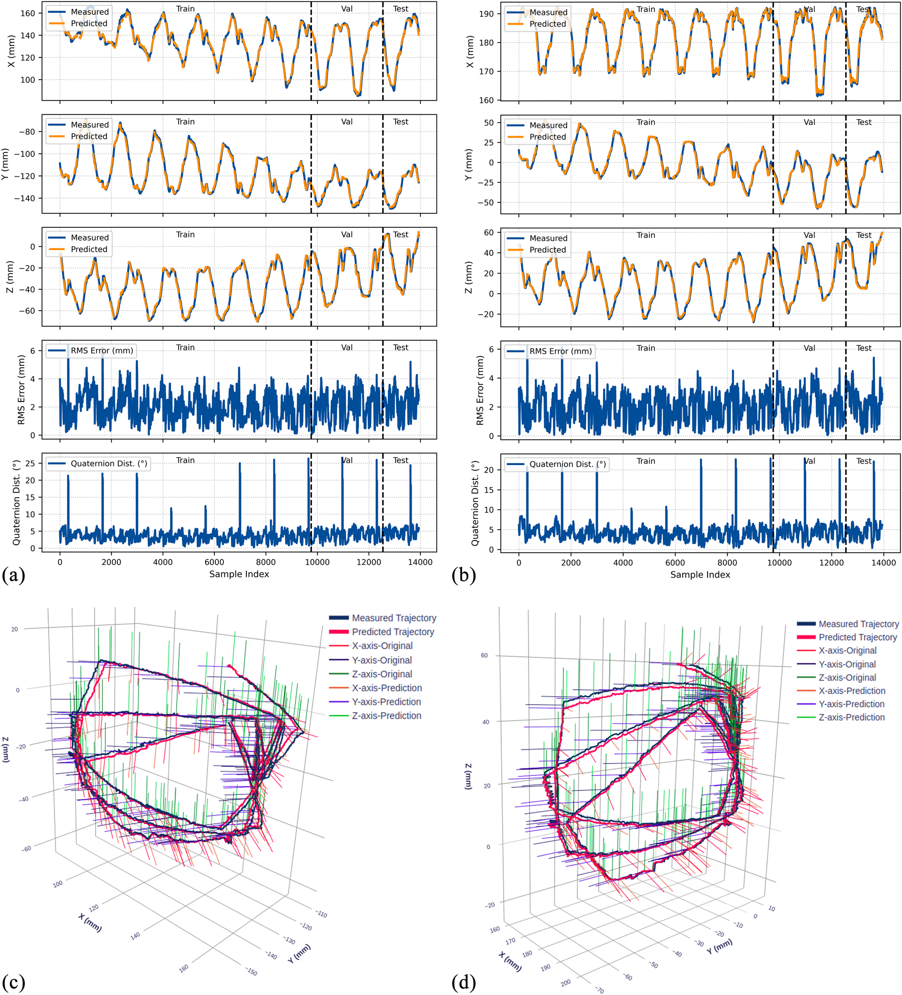 Figure 9. Experimental results for the 0° bend configuration. (a) Time-series comparison of recorded (blue) and predicted (orange) trajectories showing X, Y, and Z positions (rows 1–3), RMS position error (row 4), and quaternion distance (row 5) for the original dataset. Vertical dashed lines indicate validation (Val) and test (Test) data boundaries. (b) Identical metrics for the rotated dataset. (c) 3D trajectory visualization showing recorded data (blue lines) and predicted trajectories (red lines) from validation and test sets, with axes in mm. (d) 3D trajectory visualization for the rotated dataset.