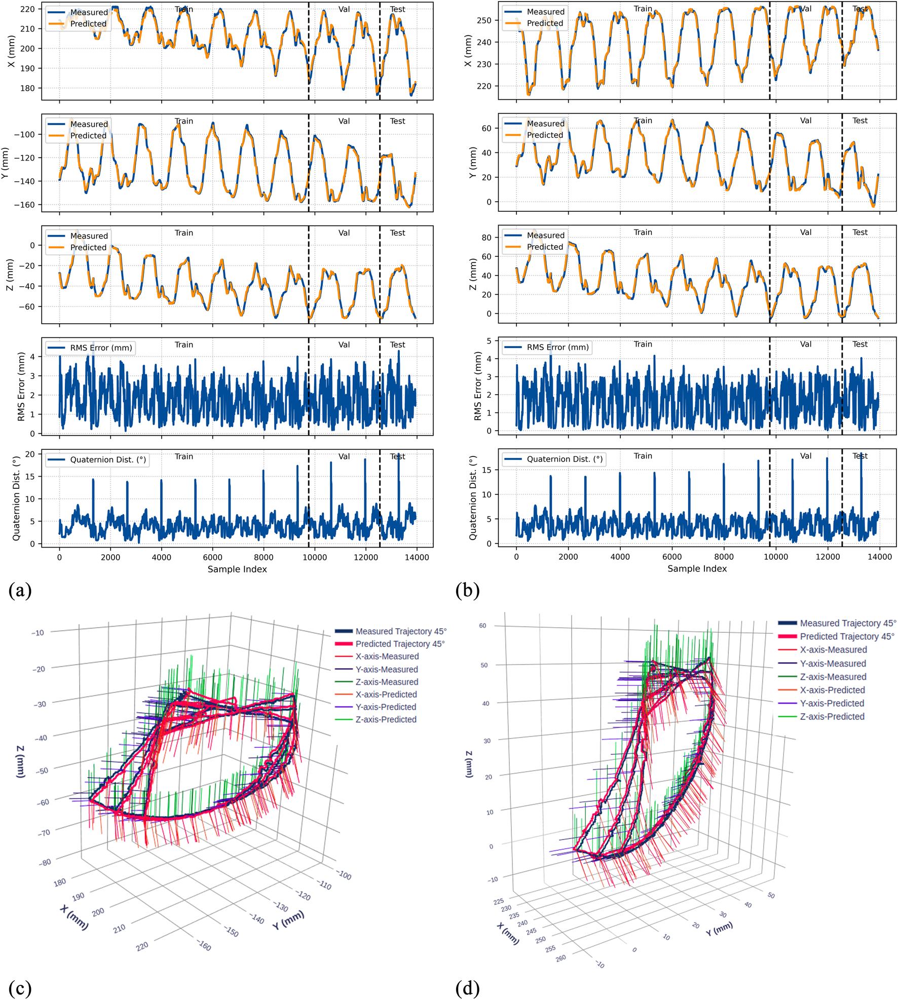 Figure 10. Experimental results for the 45° bend configuration. (a) Time-series comparison of recorded (blue) and predicted (orange) trajectories showing X, Y, and Z positions (rows 1–3), RMS position error (row 4), and quaternion distance (row 5) for the original dataset. Vertical dashed lines indicate validation (Val) and test (Test) data boundaries. (b) Identical metrics for the rotated dataset. (c) 3D trajectory visualization showing recorded data (blue lines) and predicted trajectories (red lines) from validation and test sets, with axes in mm. (d) 3D trajectory visualization for the rotated dataset.