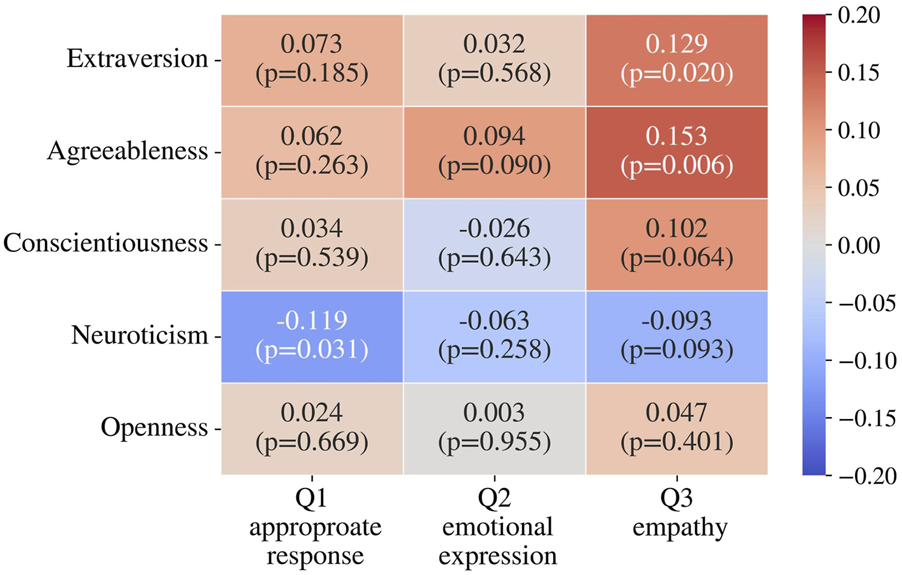 The correlations between the Big Five personality traits obtained before the experiment and the questionnaire responses were analyzed using Spearman’s rank correlation coefficient. The results are shown in Figure 5. In general, there were no strong correlations between the personality traits and the results of the questionnaire. Although statistically significant negative correlation between Q1 and neuroticism (