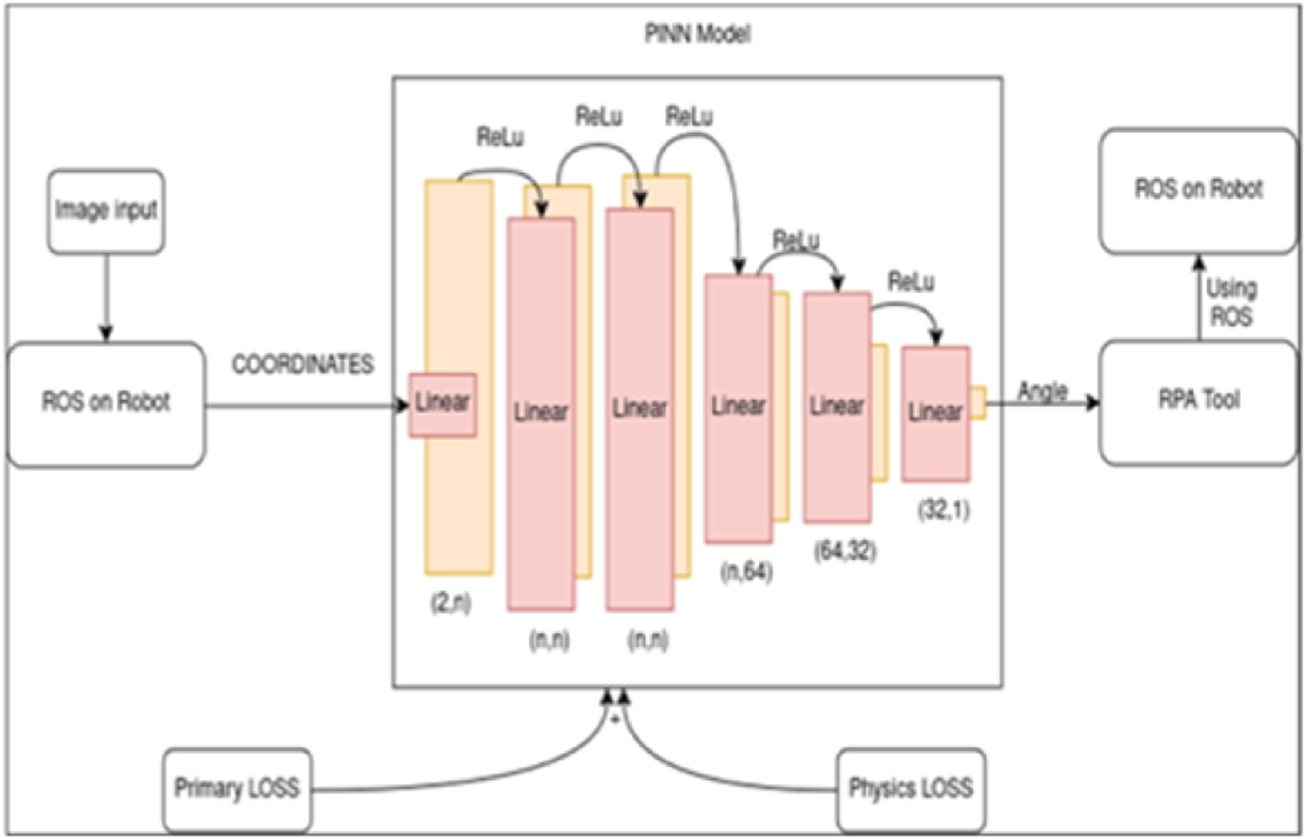 The methodology presented herein integrates several computational components to achieve automated, physics-informed control of a robotic arm. The core objective is to solve the inverse kinematics problem of determining the necessary joint angles to position the robot’s end-effector at a desired location by leveraging a Physics-Informed Neural Network (PINN). Our approach begins by identifying an object’s position using a standard object locator model. This position data then serves as the input for a custom PINN, which is designed not only to learn from training data but also to adhere to the governing kinematic equations of the robot. The RPA tool orchestrates this workflow, managing data flow between the perception model, the PINN, and the Robot Operating System, which executes the final joint movements. This architectural choice represents a key contribution, as it abstracts the complexities of both the ROS interface and the PINN model into a single, manageable workflow. By establishing this orchestrated process, we demonstrate a scalable and reproducible template for deploying. The proposed system architecture which consists the model, the RPA Tool and ROS along with object locator model which provides the loss values to efficiently communicate between the model and the robot for maximum accuracy of results. The RPA tool acts as the intermediary between the model and ROS. This is visualized and depicted in Figure 1.