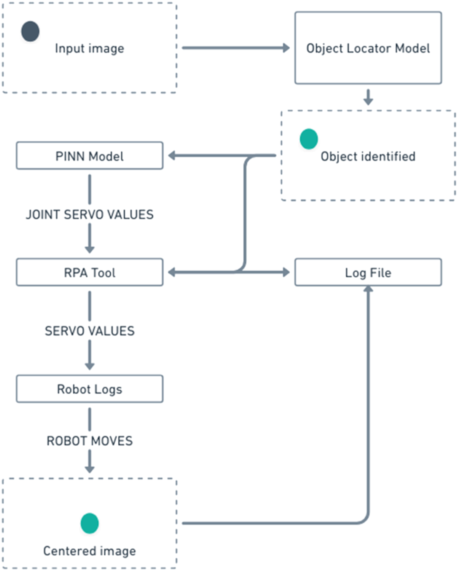 The general flow of the working of the system is represented in Figure 4, which describes it in brief. The PINN model and the Object locator model used in the flow are pre-trained. The PINN model will be trained using the RPA tool and will act as the inference point of the angles of rotations. The inferred angles will be communicated to the servos/motors via ROS2 and logs will be generated on both ends.