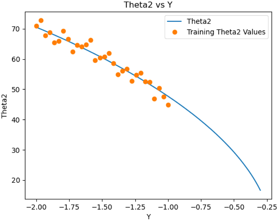 To train the model, a straight line was taken with link lengths and . and are taken as each. All length measurements are defined in centimeters (cm).To validate the model’s trajectory tracking capabilities, a linear path defined by was selected as the primary test bench. While the initial training utilized a dataset of 30 equidistant points along this trajectory to demonstrate rapid convergence, the model’s robustness was further validated against a broader set of random points within the robot’s reachable workspace to ensure it had not overfitted to a single line. The results presented below focus on the trajectory tracking performance, which is critical for continuous path applications. The points taken in total are 100 and both the training data and the 100 points are equidistant to each other on the x-axis of the graph representing relation between y and in Figure 6.