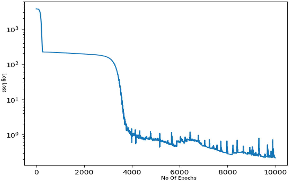 The model is trained with the physics loss for 10,000 epochs with a learning rate of with the as 0.6, which gives a loss graph represented in Figure 7 with final loss at 0.6243 for the complete extended line. The model was then used to predict all the values on the initial line of 100 points and the accuracy of the model was calculated. The model provided an accuracy of around 96% for the remaining line not trained on, as represented in Figure 8.
