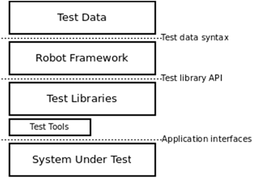 The architecture used by the tool “Robot Framework” is represented as depicted in Figure 9, where the testing data, in conjunction with the robot framework and working with the underlying test libraries and APIs contains the tasks to be performed on the lowest layer, the system under test, thus automating tasks efficiently.