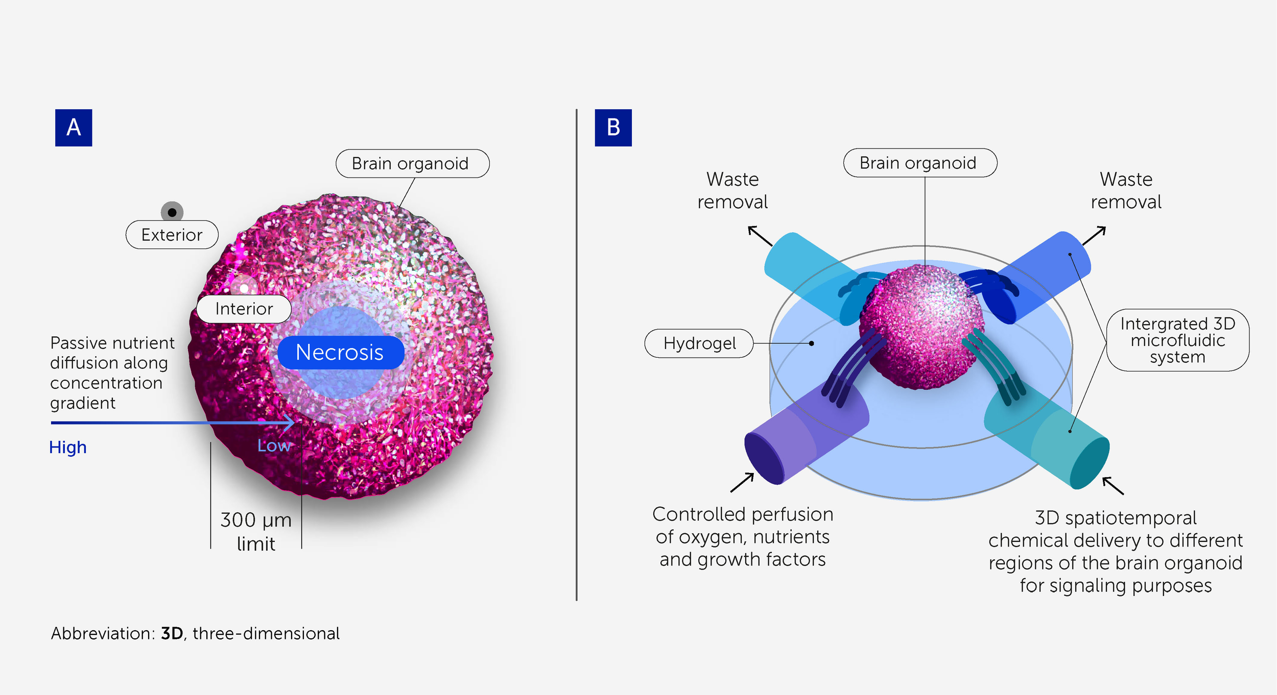 3D microfluidic devices to support scalability and long-term homeostasis of brain organoids. (A) Cells within brain organoids require perfusion with oxygen, nutrients, and growth factors, as well as the removal of waste products, to provide conditions approximating physiologic homeostasis. Passive diffusion penetrates to a depth of only around 300 μm, and so necrosis occurs at the core of larger organoids owing to starvation. This prevents brain organoids from being scaled up to the size and complexity required for OI research and limits their durability. (B) 3D microfluidic systems enable greater scalability and durability by providing controlled perfusion throughout larger organoids. They also enable 3D spatiotemporal dosing of chemicals for signaling purposes.