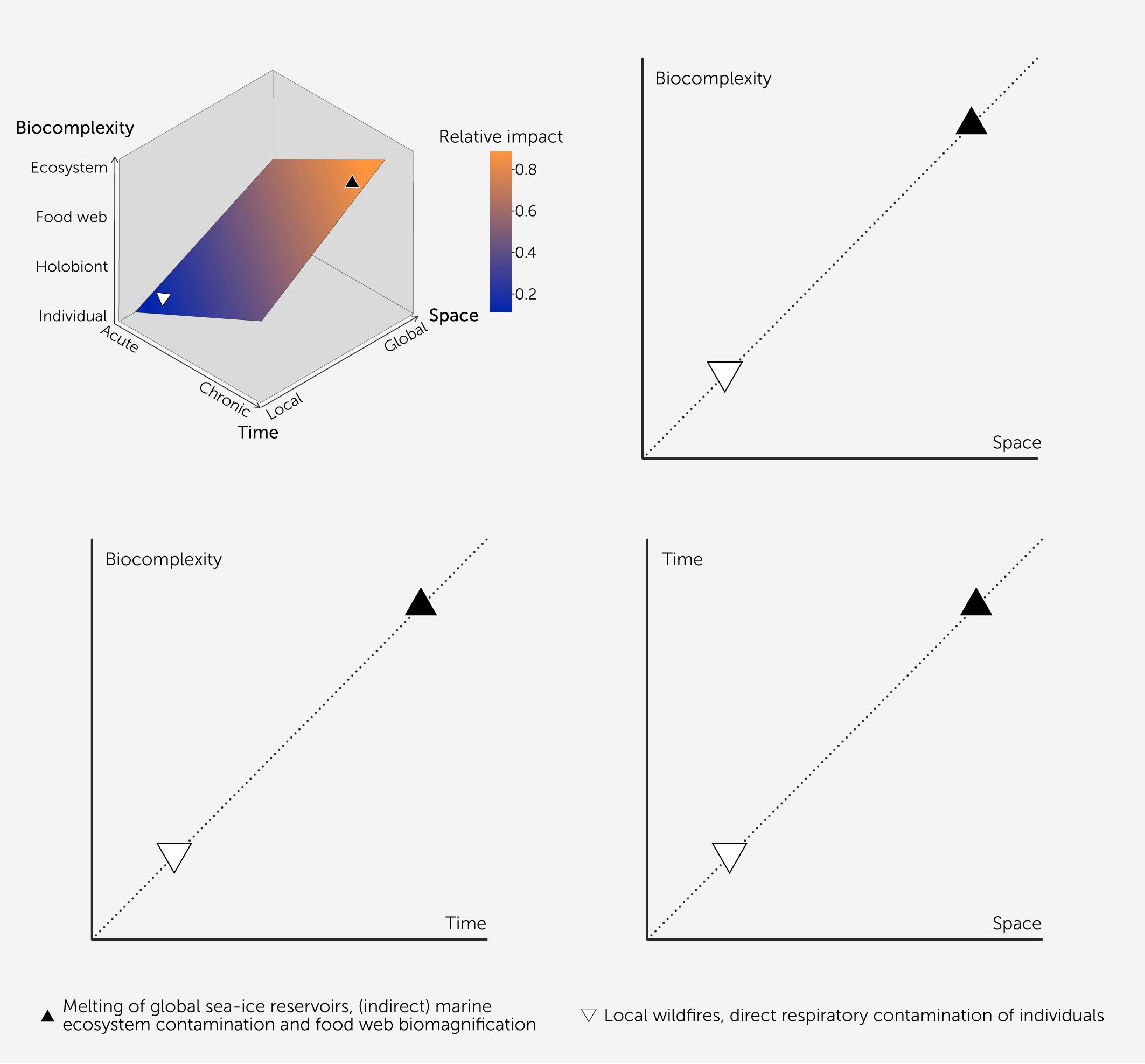 Figure 2. Schematic of the three dimensions across which climate change and plastic pollution operate. An illustrative figure showing the general pattern of how spatial and temporal scaling and organizational complexity commonly co-vary in most studies to date. These tend to be small and simple, with far fewer that capture the relevant scales and levels of biocomplexity in the field. These three dimensions (i.e., space, time and biological organization) are often strongly correlated (as shown by the exemplars denoted by the triangle symbols), although exceptions can potentially arise under certain conditions (e.g., the localized but long-term impacts of bioaccumulation on long-lived sedentary organisms in urban hotspots).