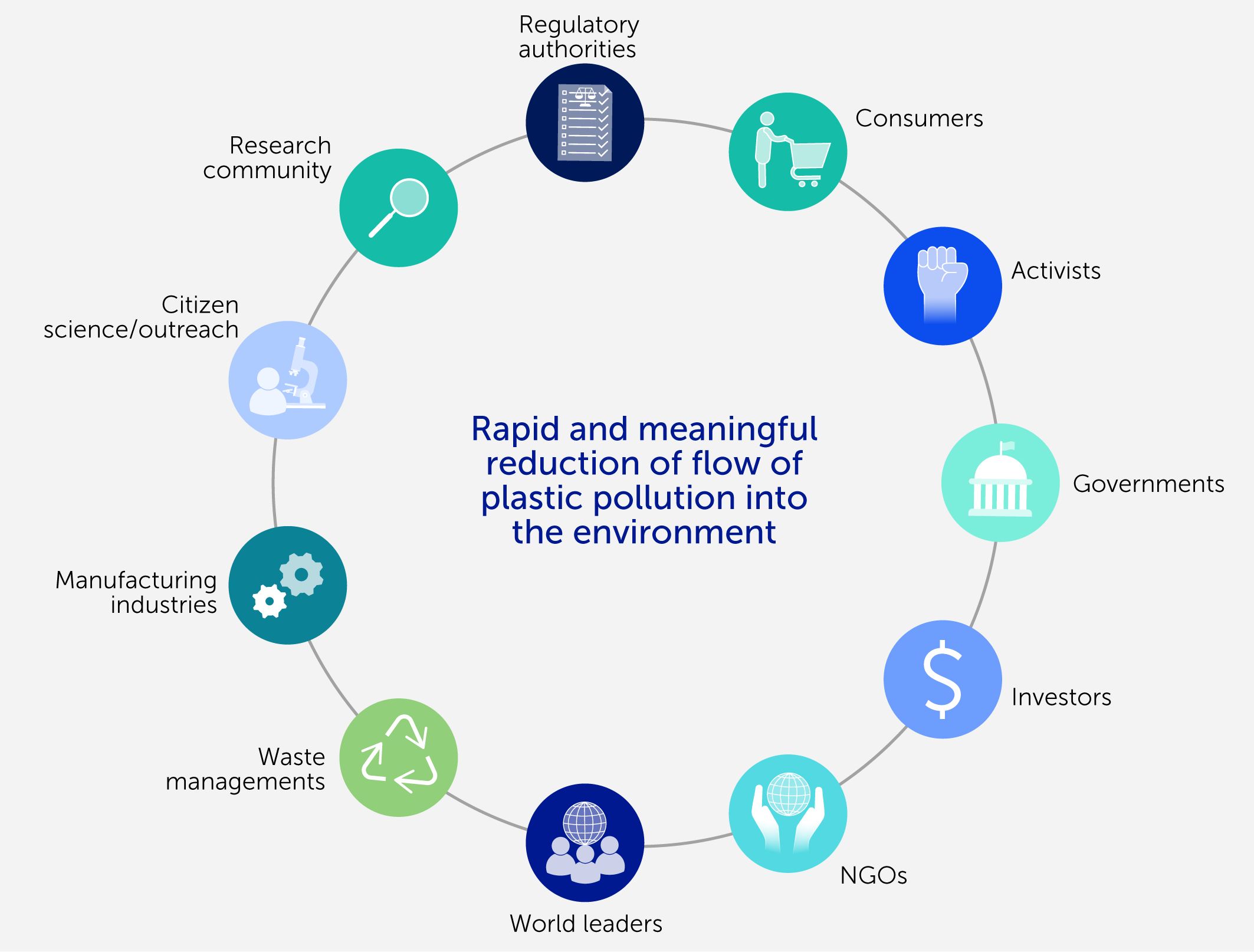 The rational response to confront the potential for poorly reversible negative impacts to occur through the increased generation, mobility and toxicity of MPs is to rapidly and meaningfully reduce the emissions of plastic pollution into the environment. The efforts required to achieve this are extraordinary and require significant societal, economic, and commercial shifts (193). Therefore, it is reassuring that the consensus is that this is a largely avoidable environmental problem, insofar as the benefits of plastics to the environment and society can be retained without the need for end-of-life plastics to accumulate in the environment (194). This requires an international and coordinated approach, encompassing the manufacturing industry, sectors (including consumers) using plastics, waste management services, environmental organizations, activists, regulatory authorities, governments, world leaders, investors, and the research community in both plastics and the environment (Figure 3). The world is already responding on an impressive scale, with examples, including grassroots action (195), globally active charities, for example the Ellen MacArthur Foundation (196), national-level product bans (197), initiatives to support the management of hazardous plastic waste (198) and public–private partnerships for waste management, including the Alliance to End Plastic Waste. However, the biggest achievement and greatest hope for success would be to establish an international, legally binding Global Plastics Treaty to end plastic pollution by transforming the way it is sourced, produced, used, and disposed of (23). Unfortunately, the latest round of negotiations in Geneva in August 2025 failed to produce the Treaty, as deep disagreements, particularly over whether to cap plastic production and regulate toxic additives, led to a breakdown of consensus despite the presentation of two draft texts. Negotiations were adjourned, to be resumed at an undetermined future date (199).