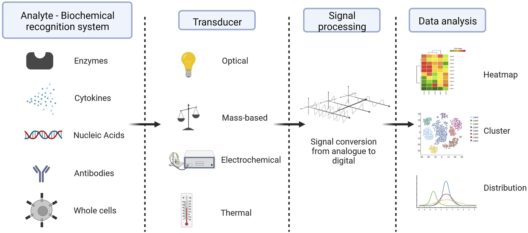 A biosensor is defined as a self-contained integrated device which is capable of providing specific quantitative or semi-quantitative analytical information using a biological recognition element (biochemical receptor) which is retained in direct spatial contact with an electrochemical transduction element (Thevenot et al., 1999). Therefore, the two main components of a biosensor are a biochemical recognition system and a physicochemical transducer. The biochemical recognition system translates input from the biochemical domain (e.g., ionophores, enzymes, antibodies and cytokines, amongst others) into a chemical or physical output signal. The transducer transforms the information from the biochemical receptor into a signal that is proportional to the amount of analyte present in the sample. The different types of transducers are based on electrochemical principles (amperometric, potentiometric, or conductometric), optical principles (absorbance, reflectance, fluorescence), mass-sensitivity (piezo-electric), or thermal principles (calorimetric, pyroelectric) (Thevenot et al., 1999) (Figure 3). Biosensors are an important diagnostic tool already in use nowadays (e.g., pregnancy tests, rapid antigen tests for COVID-19) and have received increased interest for non-invasive wireless point of care applications (Arumugam et al., 2020; Heidt et al., 2020).
