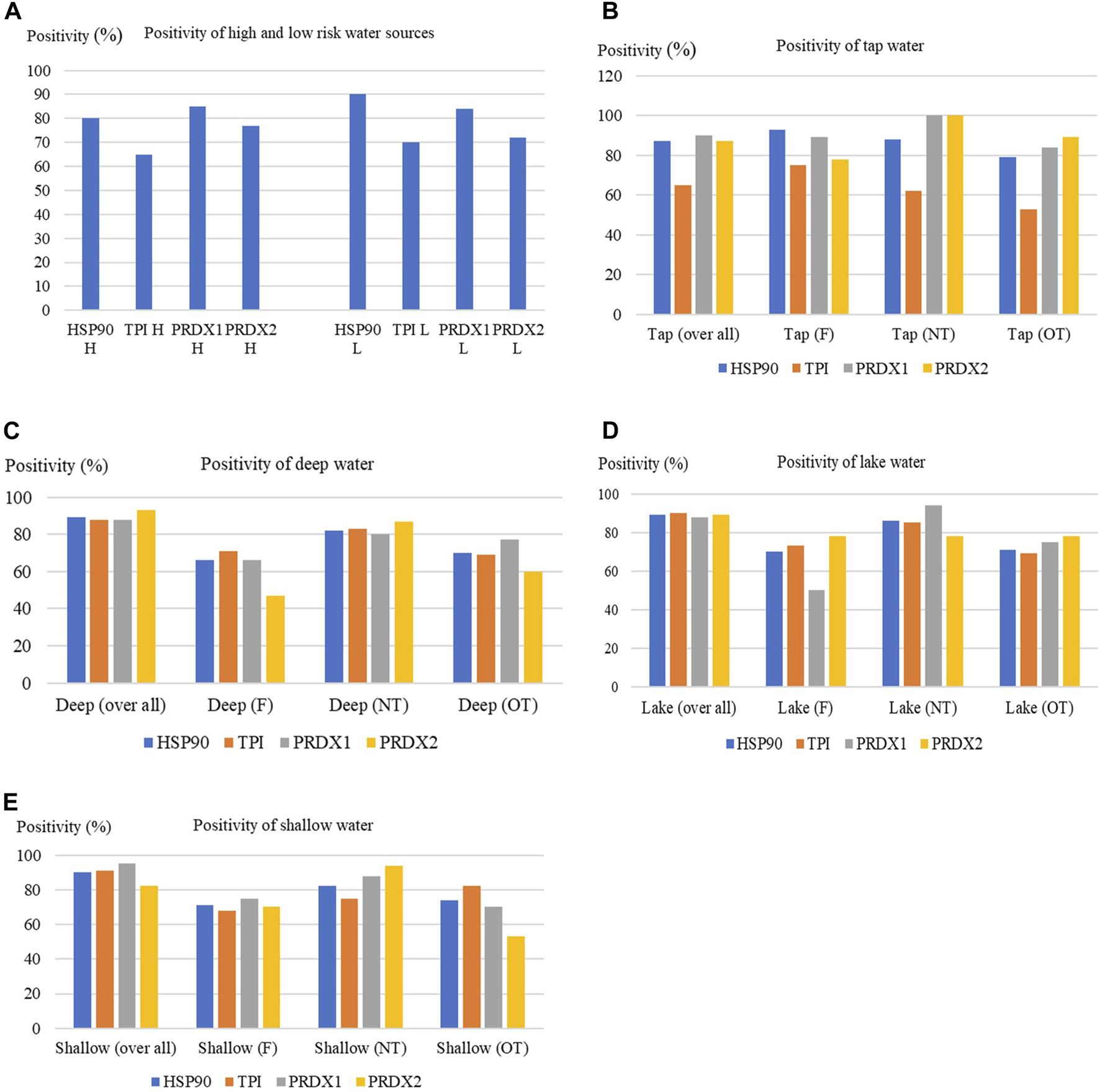 Generally, the individuals who take water from the low risk water source (including tap water and deep water) showed no significantly different outcomes when compared with individuals who use the high risk water source (including lake and shallow water) (Table 1; Figure 5A; Supplementary Figure S2). Interestingly, individuals that sourced the tap water NT (no treatment), which is the low risk water, showed the worst outcomes for both PRDX 1 and 2, indicated by the highest positive rate (100%) (Figure 5B). The low risk water, deep water with other treatment (OT; treatment other than filtered) and high risk water, lake water with NT showed the lowest positive rates (42% and 50%, respectively) against TPI when comparing with individuals taking other water sources (Figures 5C, D). The lake water with OT gave the highest positive rate (78%) (Figure 5D). While high risk water, shallow water [with filtering (F) and OT] result in the lowest positive rates to PRDX1 (75%) and PRDX 2 (53%), respectively (Figure 5E). For HSP90, shallow water NT gave the highest positive rate; while the tap water OT, the lowest.