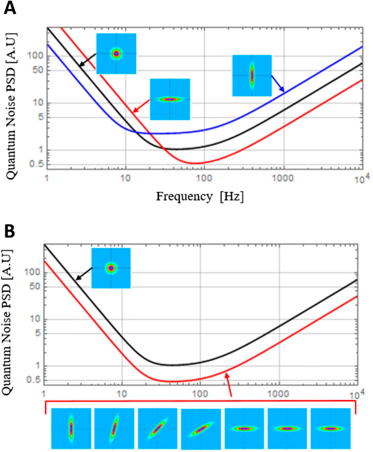 Figure 1. Frequency dependent squeezing for GW detectors. (A) Power Spectral Density (PSD) of the standard quantum noise (black line) and for the case where the coherent vacuum field is replaced with a phase (red line) or amplitude (blu line) squeezed vacuum state. Injecting frequency-independent squeezed light, quantum noise can be lowered in a portion of the spectrum while it is increased in the other. (B) PSD of the noise with the injection of squeezed light with an optimized frequency-dependent squeezing angle (red).