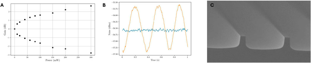 Figure 2. (A) Parametric gain measured at 1,550 nm from a MgO:PPLN waveguide as a function of the pump power at 775 nm. (B) Squeezing measured from a spectrum analyzer at 8 MHz in zero span mode. The blue line represents the shot noise level. (C) Scanning electron microscope image of diced ridge waveguides in MgO:PPLN from Berry et al. (2019).