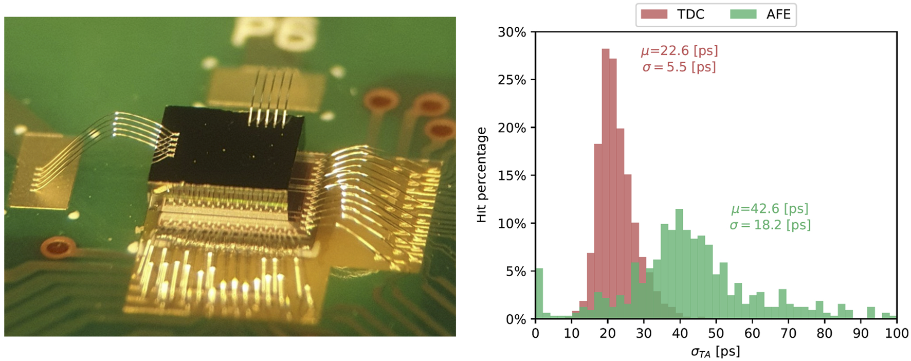 Left: The Timespot1 ASIC hybridized to a 3D-trench pixel matrix (placed on top). Right: Distribution of time resolutions , acquired on test-bench, for the time arrival measured at the output of the Analog Front End and on the TDC only. The jitter performance on the AFE, although satisfactory in average, ranges on from 10 ps to 100 ps.