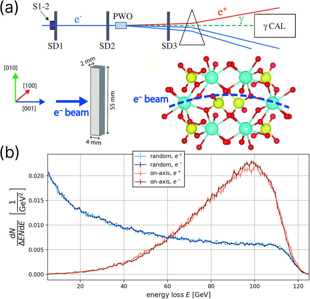 Figure 1. (a) Top: Experimental setup at CERN SPS H4 line, as in the experiment reported in (Bandiera et al., 2018). (a) Bottom: Orientation of the PWO crystal relative to the impinging electron beam and the view of the crystal lattice from the beam’s perspective are also shown. Adapted from (Bandiera et al., 2018). (b) Radiation energy loss resulting from the interaction of 120 GeV positron and electron beams with 4 mm PWO crystal in random (light blue and blue dots) and axial ([001]) orientation (orange and red dots). Spectra are normalized w.r.t. the total number of incident particles (N). Adapted from (Soldani et al., 2022).