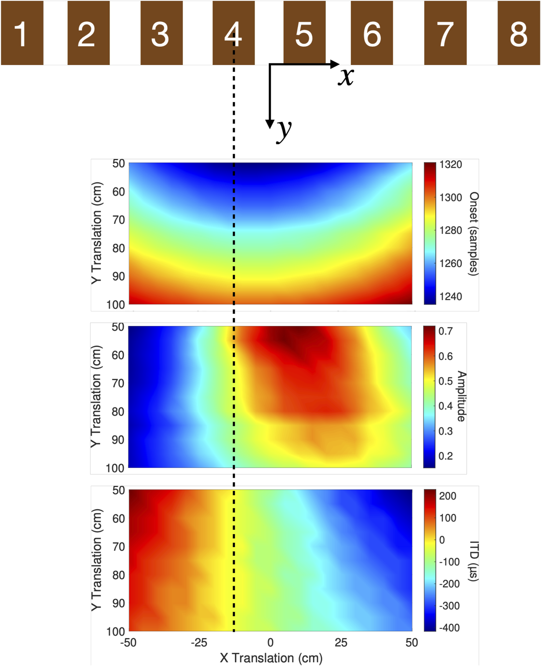 We examine the dataset by visualizing 1) the time index of the BRIR onset, 2) the peak amplitude of the BRIR, and 3) the interaural time difference (ITD) of the BRIR as functions of the listener position. Both the onset and the ITD of the BRIRs were calculated in a thresholding approach (see Katz and Noisternig (2014) as an example). Figure 2 shows the onset, peak amplitude, and ITD of the BRIRs measured at the fourth loudspeaker (counting from the left) and with the listener facing forward. The colors in the figures were interpolated using the “interp” option of the MATLAB “pcolor” function. All three figures show clear spatial dependency on the listener’s position, with the onset increasing and the peak amplitude decreasing as the listener moved away from the loudspeaker. The ITD was nearly zero when the listener was on-axis with the loudspeaker and increased as the listener moved to off-axis positions. Note that the maxima of the peak amplitude in Figure 2 are not on-axis with the loudspeaker, which was due to the occlusion effect of the listener’s head and ear.