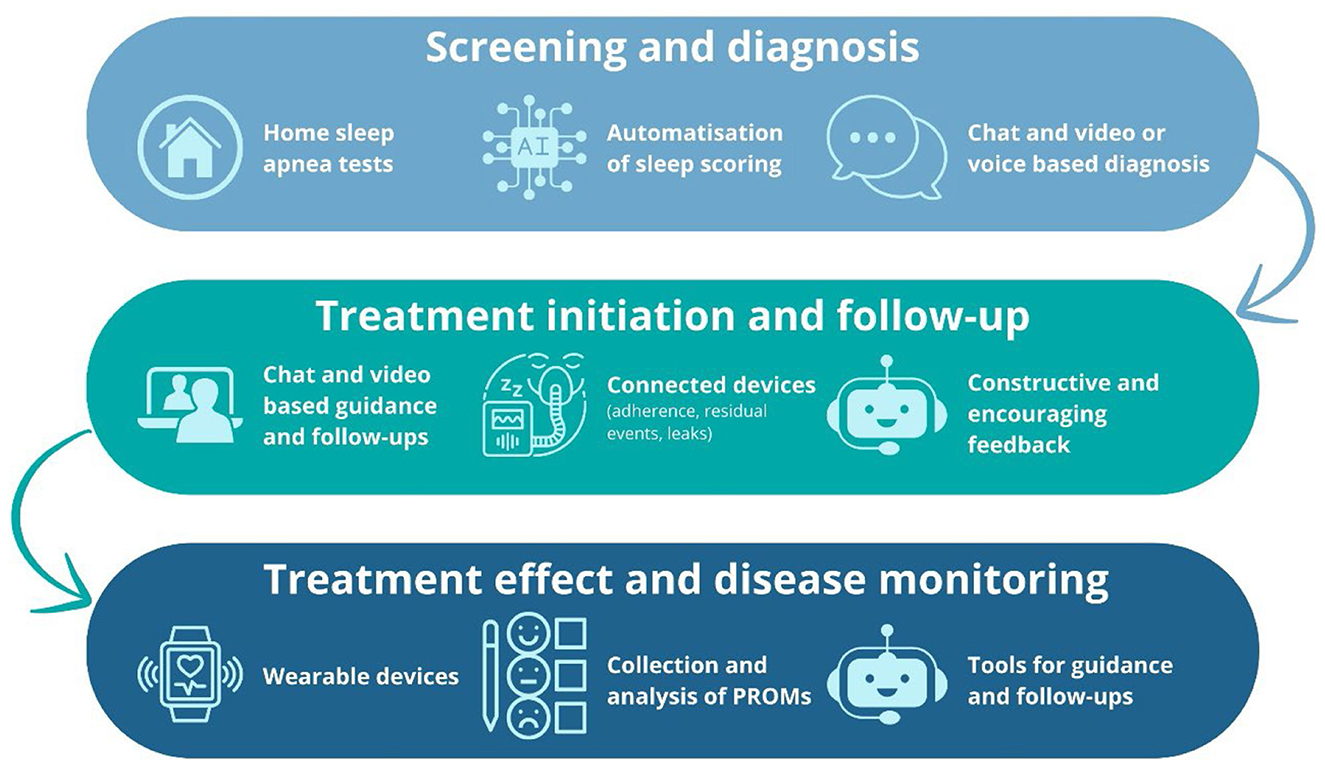 The strain on the healthcare system has partly been met with restructuring treatment protocols. An indication of this can be seen in Finland, with a marked increase in 2005–2019 in remote care and nurse visits related to OSA but not outpatient physician visits (Peuranheimo et al., 2025). Telemedicine (TM; remote delivery of care through the use of technology) (Reid, 1996) is a common denominator in these efforts. TM has been around, in its most rudimentary forms, since the mid-1990s (Shiomi, 2000), but implementation within OSA has only really taken off in the past decade or so (Fietze et al., 2022b). A report from the European Sleep Apnea Database (ESADA), shows that in 2020, TM was used in an estimated 8% of diagnosis, 50% of treatment, and 73% of follow-up of OSA patients in (participating) European sleep centers (Fietze et al., 2022b). Despite a rapid increase in implementation, there appears to be potential to further increase these numbers and most importantly optimize the extant applications. With recent advent in sophisticated artificial intelligence (AI), including large language models (LLMs), the horizon of possibilities is extended even more (Oks et al., 2025). In this perspective, we provide an overview of the current state of art of TM in OSA management, from diagnosis to subtyping to treatment follow-up and risk management (Figure 1). Several reviews have been previously published on this topic (Verbraecken, 2021; Bailly et al., 2024; Pépin et al., 2025), but this work provides a more directed focus on incorporating AI and multidimensional treatable traits (TTs)—based management, extending beyond the often-seen “one-size-fits-all” positive airway pressure (PAP)-centric treatment strategy (McDonald and Holland, 2024).