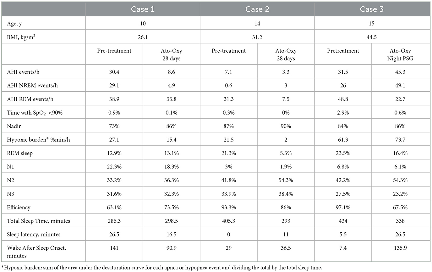 Endogenous norepinephrine withdrawal during NREM sleep and inhibitory effects of active muscarinic receptors during REM sleep are crucial in the reduction of pharyngeal dilator muscle during sleep (Chan et al., 2006; Grace et al., 2013). Atomoxetine prevents norepinephrine from being reabsorbed by the hypoglossal motor neurons increasing its level in NREM sleep. Oxybutynin blocks acetylcholine receptors on hypoglossal motor neurons (an inhibitory muscarinic process), making the genioglossus muscle more responsive in REM sleep. However, current evidence indicates that reduced activity of upper airway muscles during REM sleep is mediated by both pathways, noradrenergic and cholinergic mechanisms (Taranto-Montemurro et al., 2023). In addition, the synergistic effect of atomoxetine and oxybutynin highlights oxybutynin's role in improving upper airway collapsibility during NREM sleep (Taranto-Montemurro et al., 2023). Therefore, reducing the AHI appears to require combining atomoxetine with oxybutynin, probably due to enhanced activity of the genioglossus muscle across sleep stages. Although the underlying mechanism is not yet fully understood, the synergistic effect of adding an antimuscarinic to the noradrenergic agent seems essential for the therapeutic benefit observed. In addition, the combination has been shown to reduce arousal threshold. In these cases, Case 1 demonstrated a marked reduction in AHI during NREM sleep but not in REM, whereas in Cases 2 and 3, improvements were observed only in REM AHI; however, due to the limited amount of REM sleep in Case 2, it is difficult to determine whether the reduction in REM AHI was genuine. Nevertheless, in all three cases, as in most pediatric patients, baseline polysomnography was predominantly characterized by REM-related OSA. Understanding why REM AHI or NREM AHI improves in some cases but not others would warrant further evaluation in a larger cohort of children with severe OSA.
