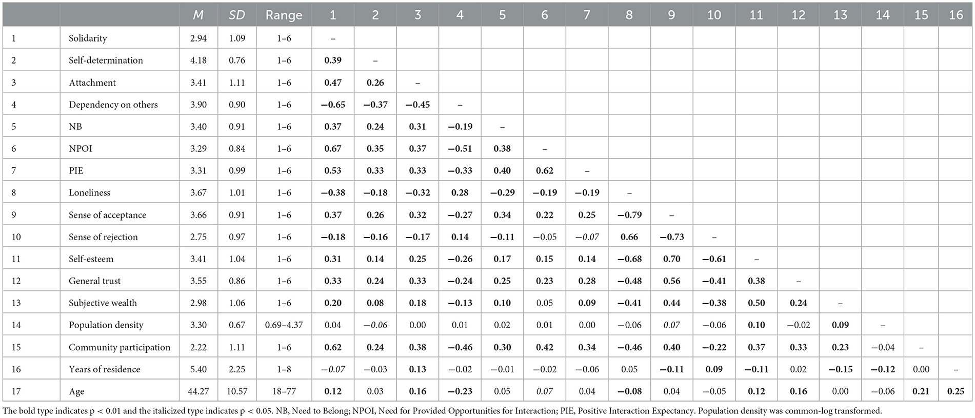 Sense of community consists of four sub-concepts: (1) solidarity, defined as the extent to which individuals actively cooperate with others to improve the community; (2) self-determination, referring to the belief that citizens should have the right to make decisions for the benefit of the community; (3) attachment, indicating the level of pride in and emotional connection to the community; and (4) dependency on others, representing the belief that responsibilities should be left to the government or highly motivated individuals (Ishimori, 2004). These were measured using 12 items taken from Ishimori et al. (2013). This scale consisted of four sub-concepts (three items each): (1) solidarity, including, “I want to participate in social activities such as volunteering in my community”; (2) self-determination, including, “To solve problems in the community, it is important to build an equal relationship between the community residents and the government”; (3) attachment, including, “I feel a sense of pride and attachment to the community in which I live”; and (4) dependency on others, including, “I believe that environmental improvements in the community should be left to the government.” The mean of each set of three items was calculated, with higher scores indicating greater sense of community in solidarity, self-determination, and attachment, but lower sense of community in dependency on others. The reliability coefficients (Cronbach's α) for each sub-concept were 0.92, 0.74, 0.86, and 0.79, respectively. Although the sense of community and need to belong are conceptually related, the results of this study indicate only a moderately positive correlation between the two variables, suggesting that they represent distinct concepts.